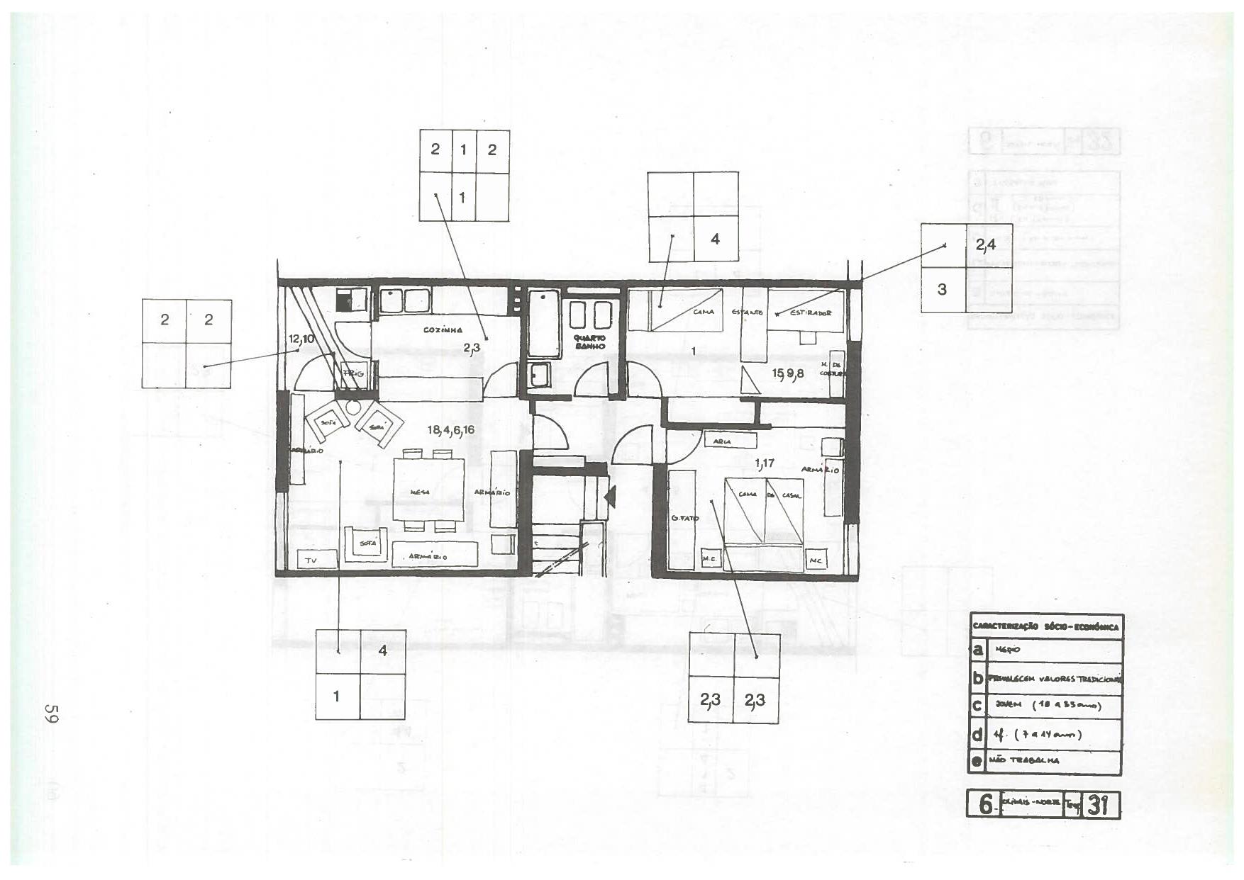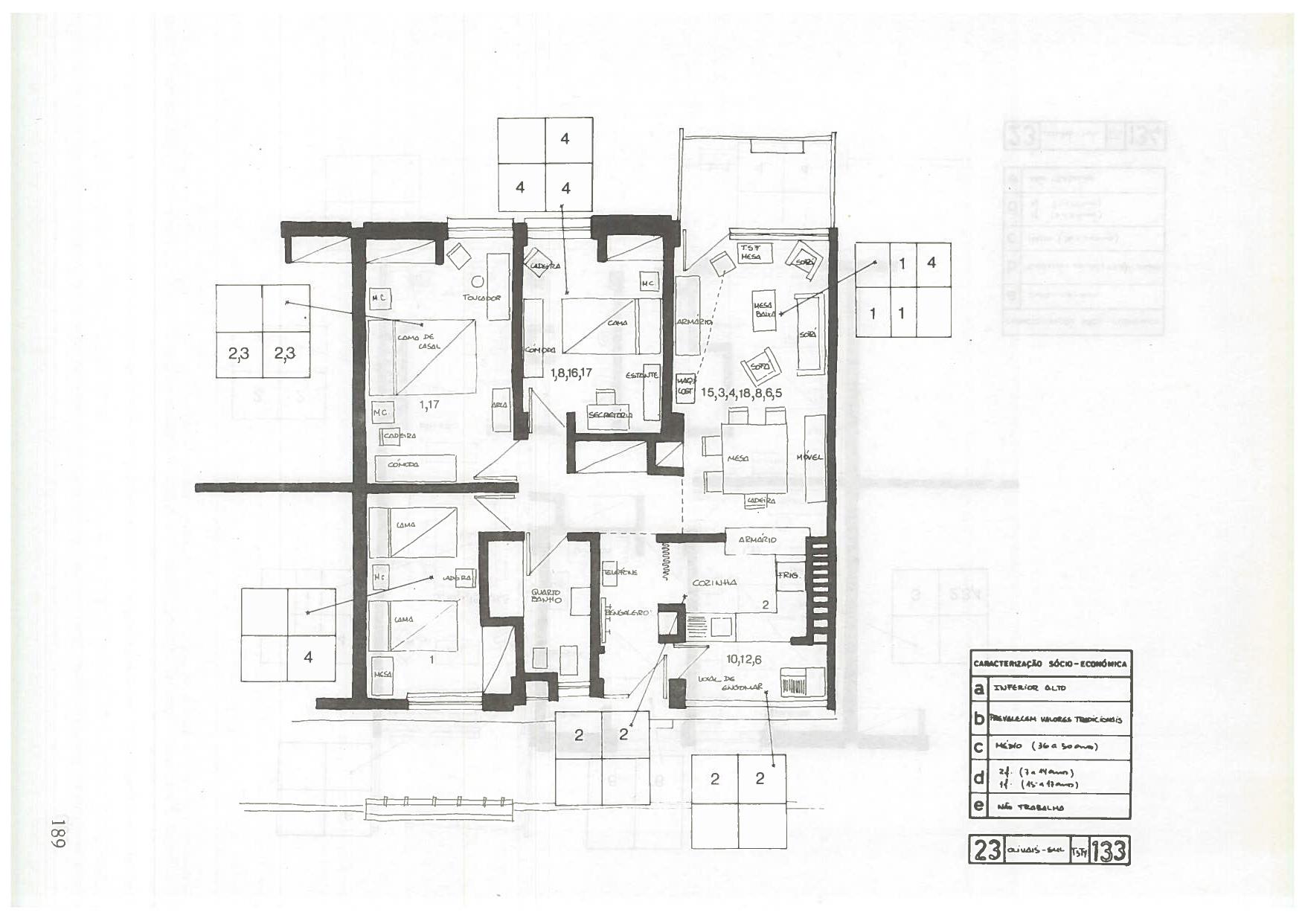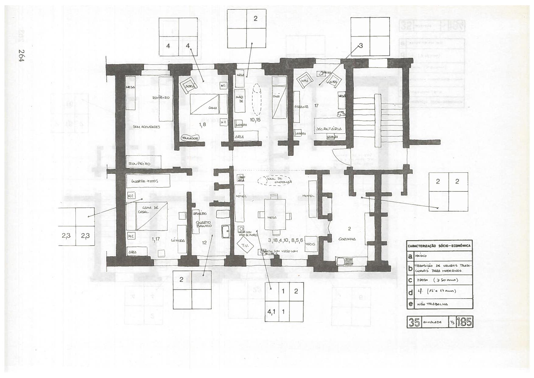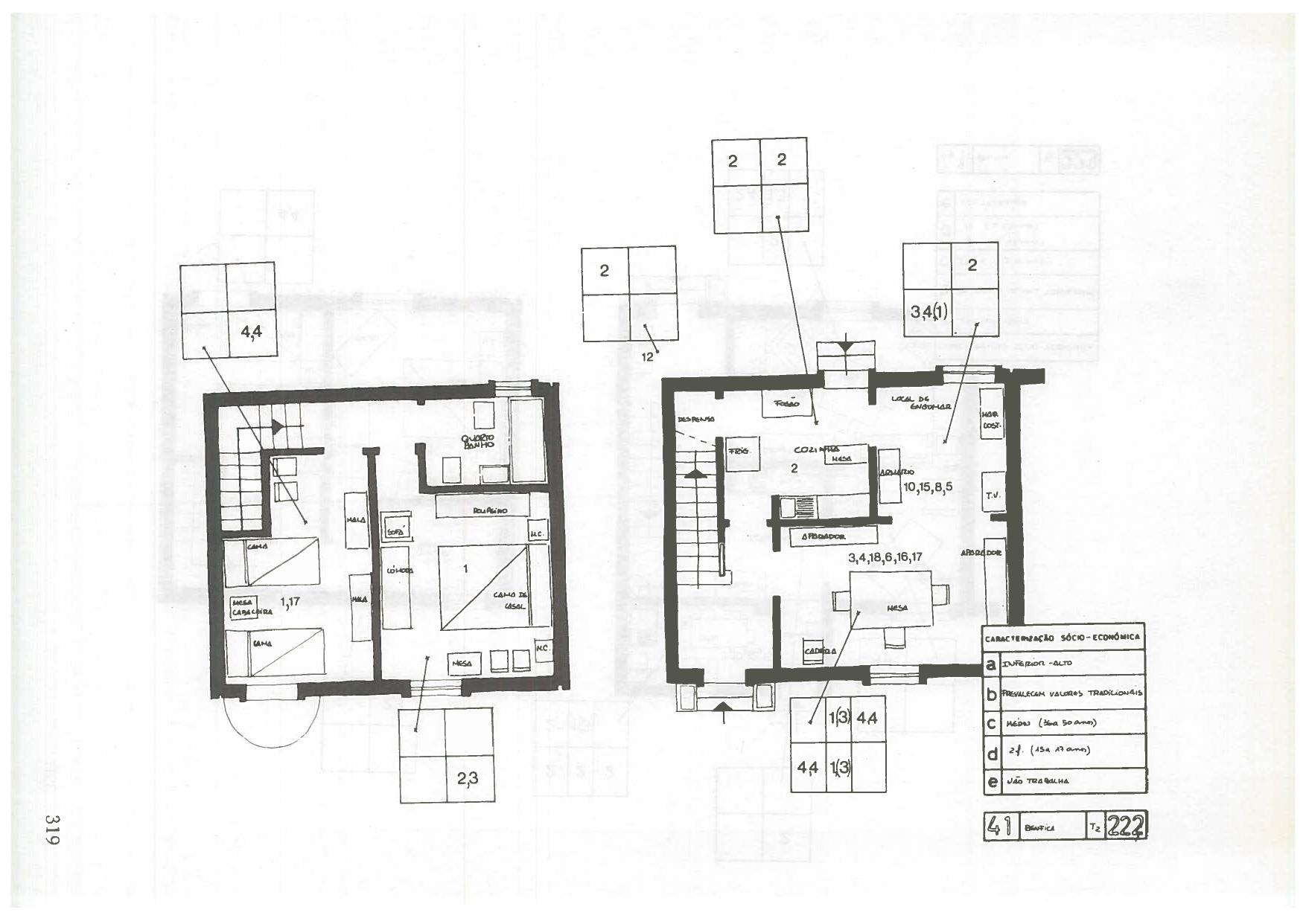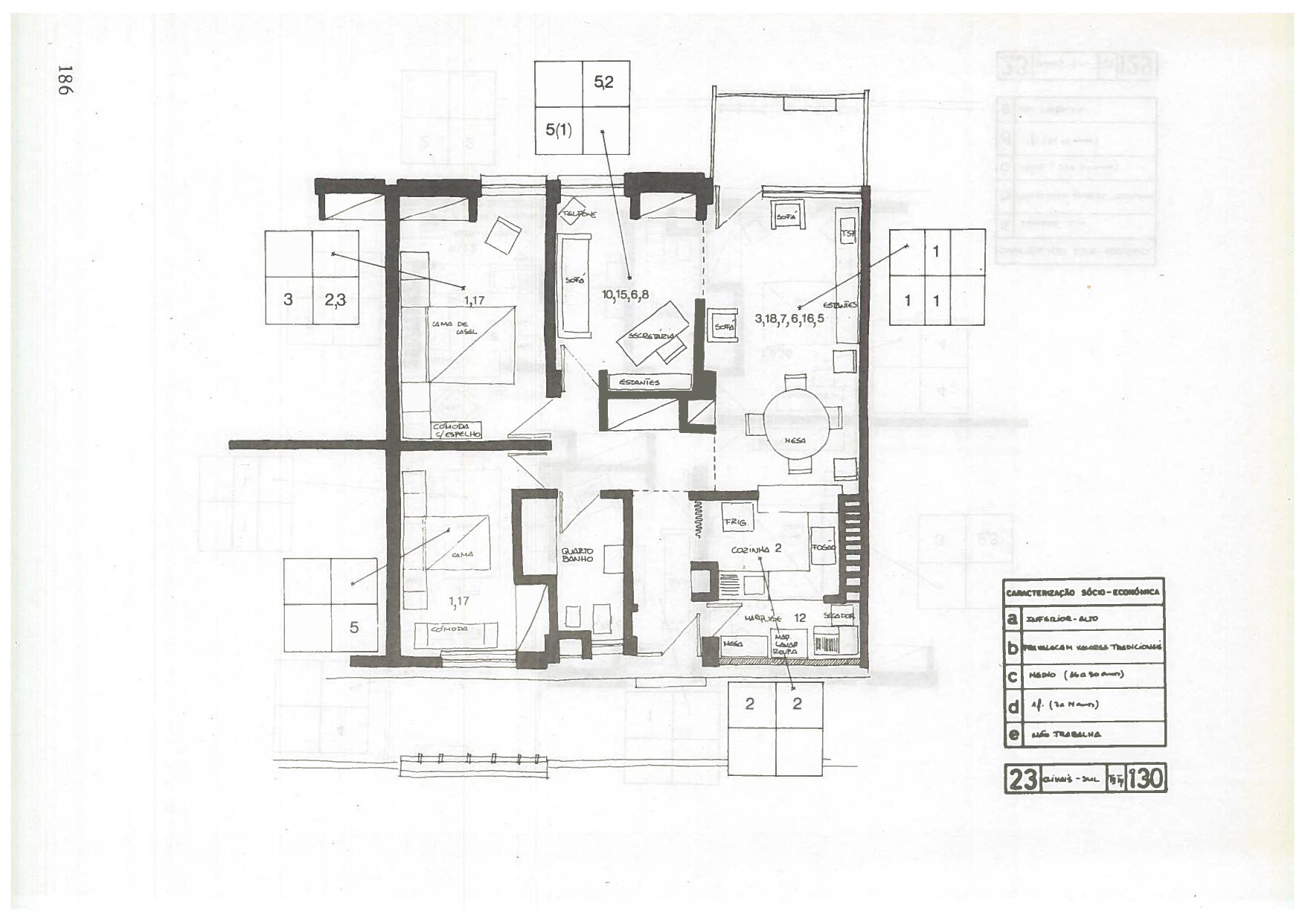 A series of interpretative and quantitative questionnaires were conducted on 300 families. For each family, a plan was published in the survey, providing information on where domestic activities take place, and where and when household members are usually located in the house. The interior space was divided into rooms labelled according to a general function, such as kitchen, living room and bedrooms. For each family, the arrangement and disposition of furniture were registered. In each labelled room, it was represented which domestic activities took place, and which family members were usually present at the different times of day (defined as morning, lunch time, afternoon, evening and night).