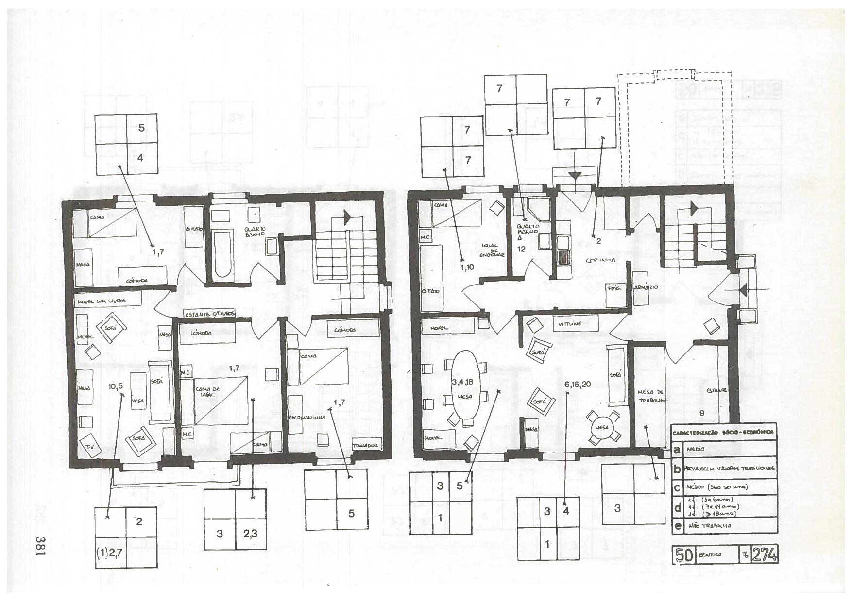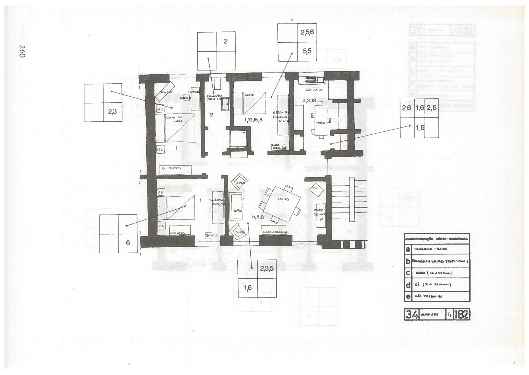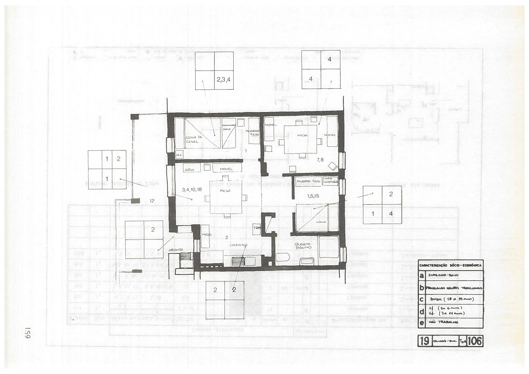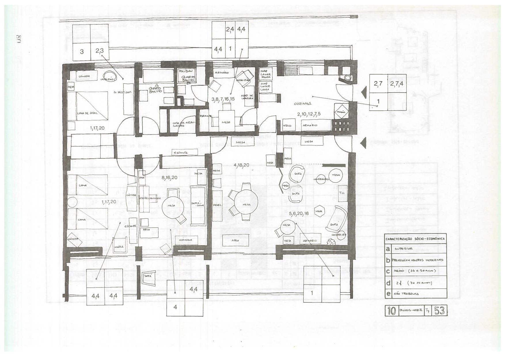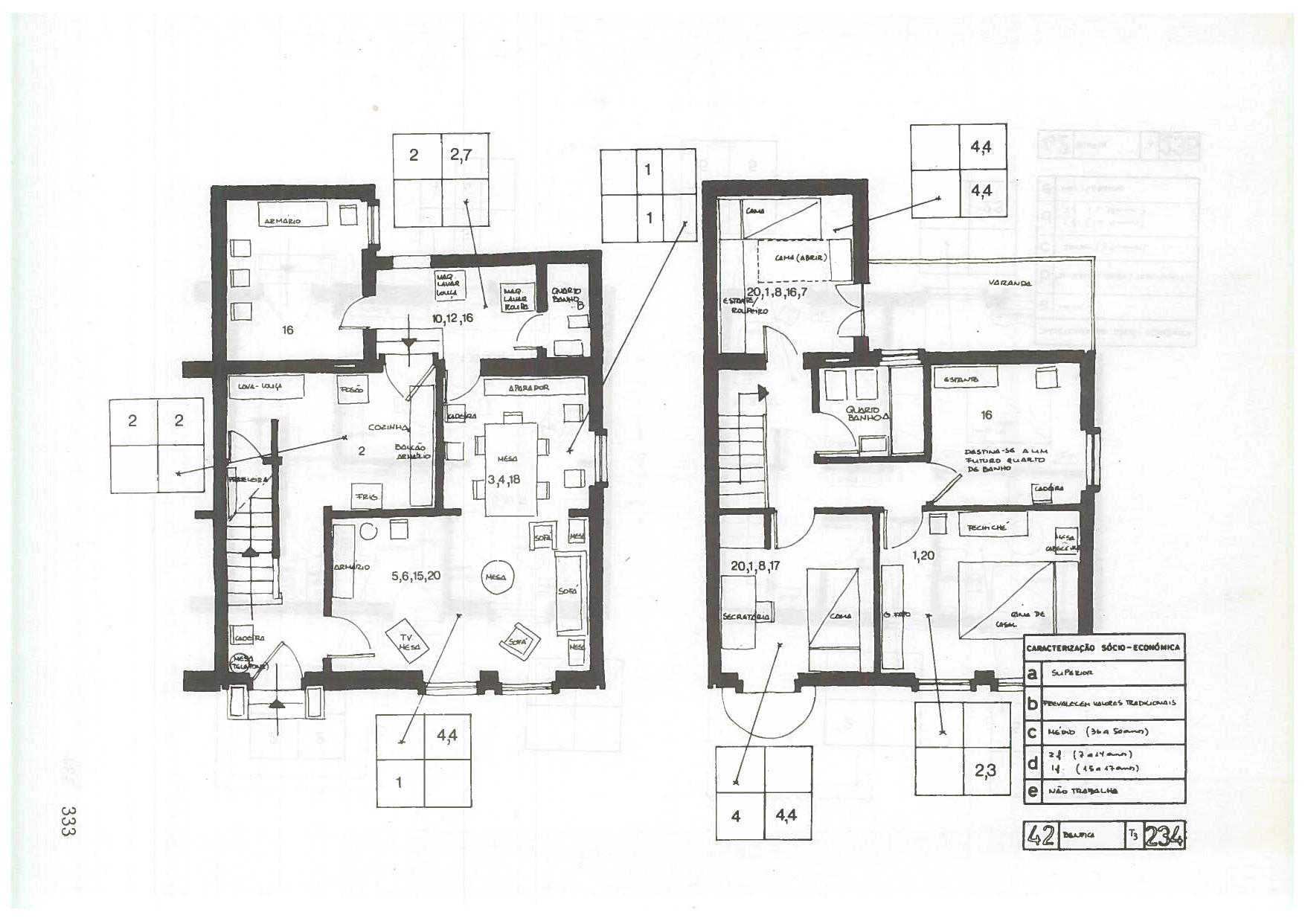 A series of interpretative and quantitative questionnaires were conducted on 300 families. For each family, a plan was published in the survey, providing information on where domestic activities take place, and where and when household members are usually located in the house. The interior space was divided into rooms labelled according to a general function, such as kitchen, living room and bedrooms. For each family, the arrangement and disposition of furniture were registered. In each labelled room, it was represented which domestic activities took place, and which family members were usually present at the different times of day (defined as morning, lunch time, afternoon, evening and night).