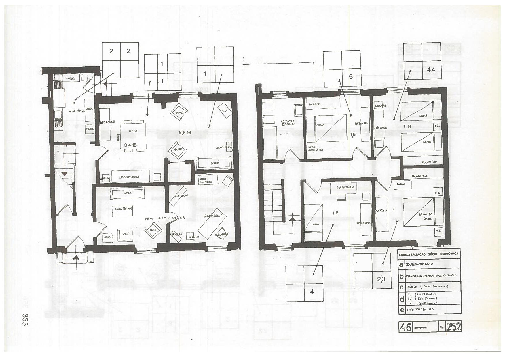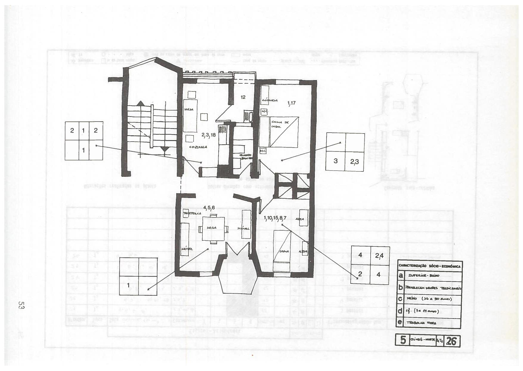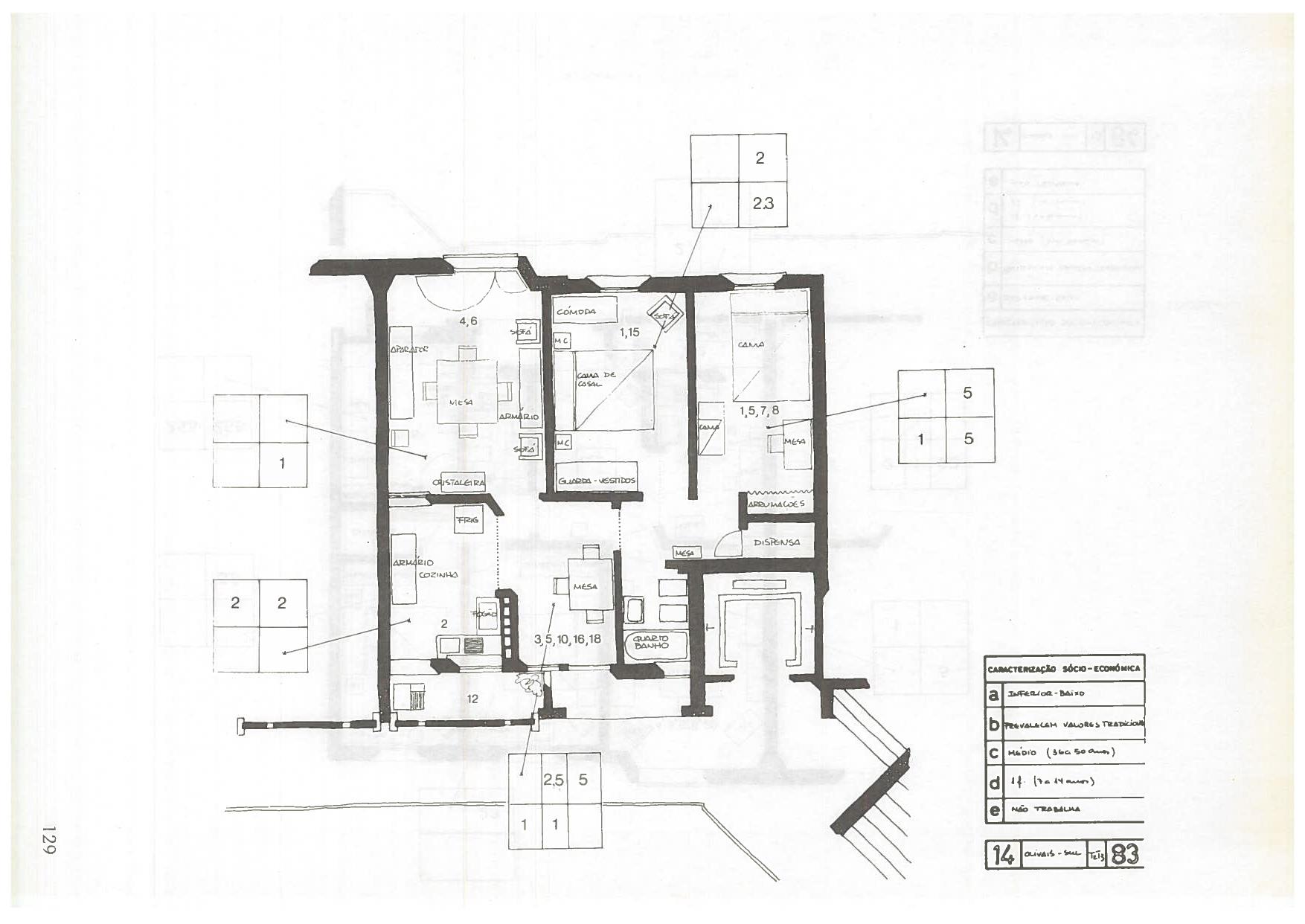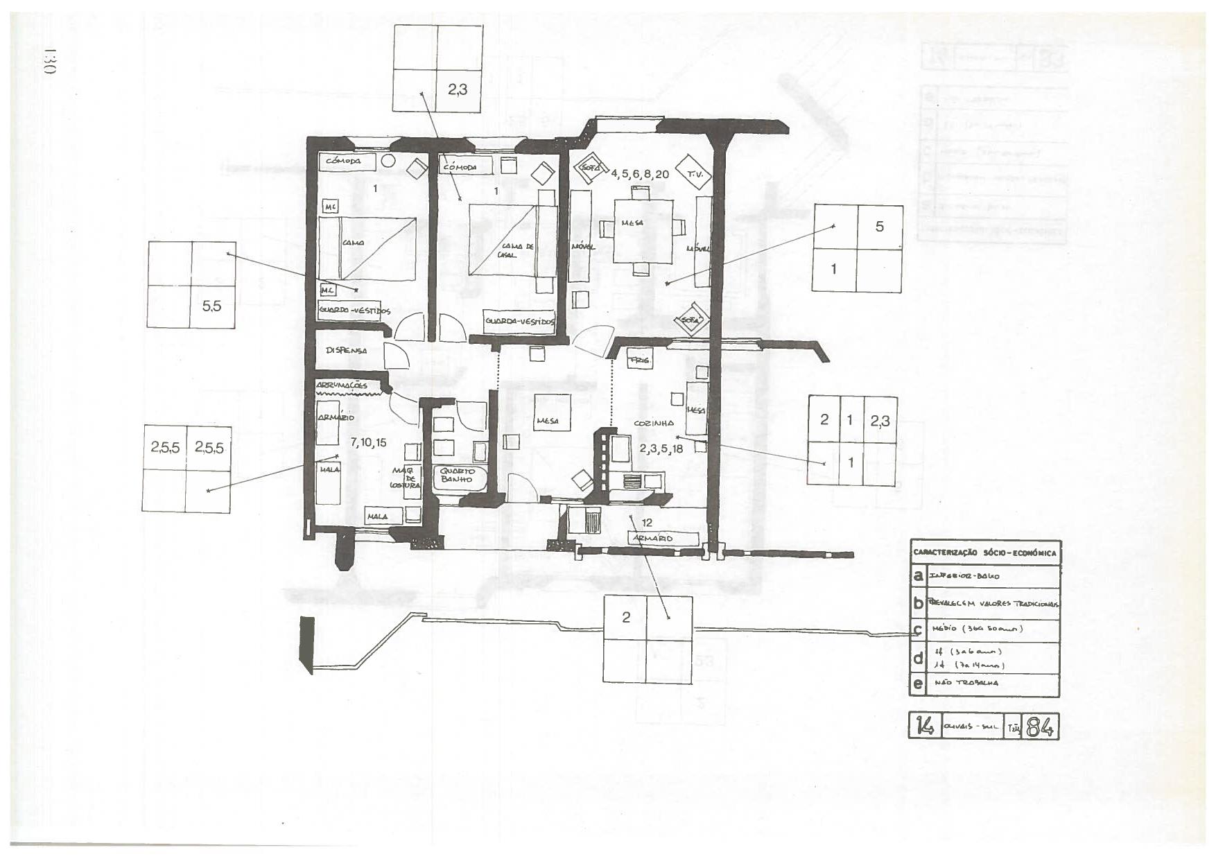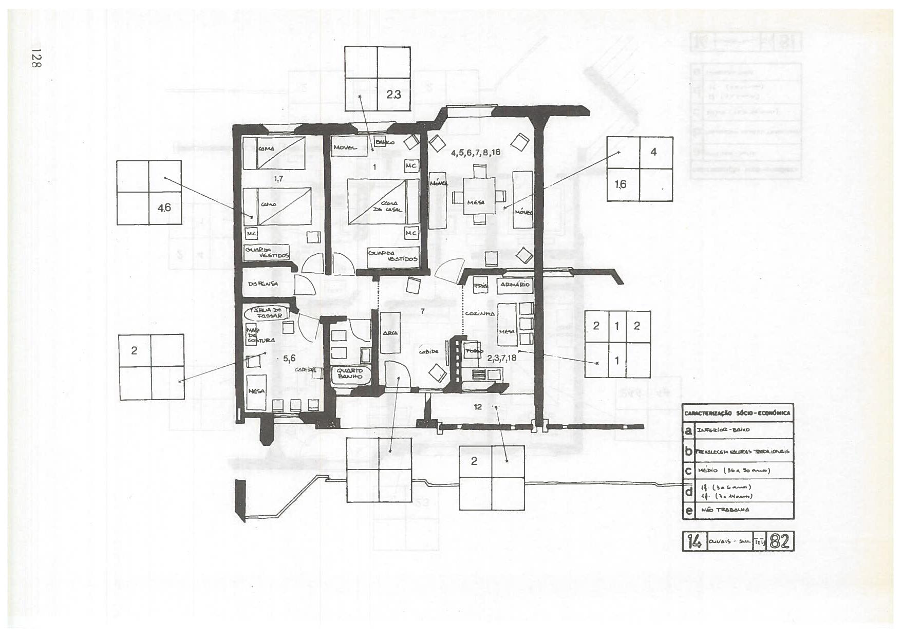 A series of interpretative and quantitative questionnaires were conducted on 300 families. For each family, a plan was published in the survey, providing information on where domestic activities take place, and where and when household members are usually located in the house. The interior space was divided into rooms labelled according to a general function, such as kitchen, living room and bedrooms. For each family, the arrangement and disposition of furniture were registered. In each labelled room, it was represented which domestic activities took place, and which family members were usually present at the different times of day (defined as morning, lunch time, afternoon, evening and night).