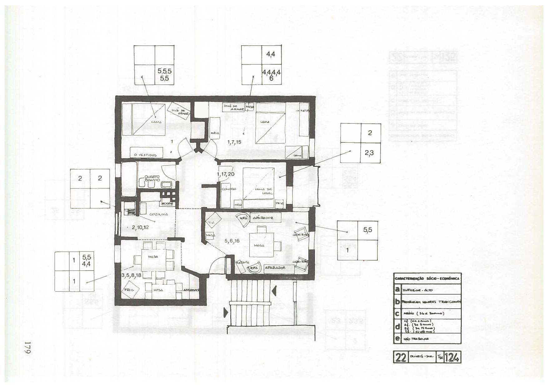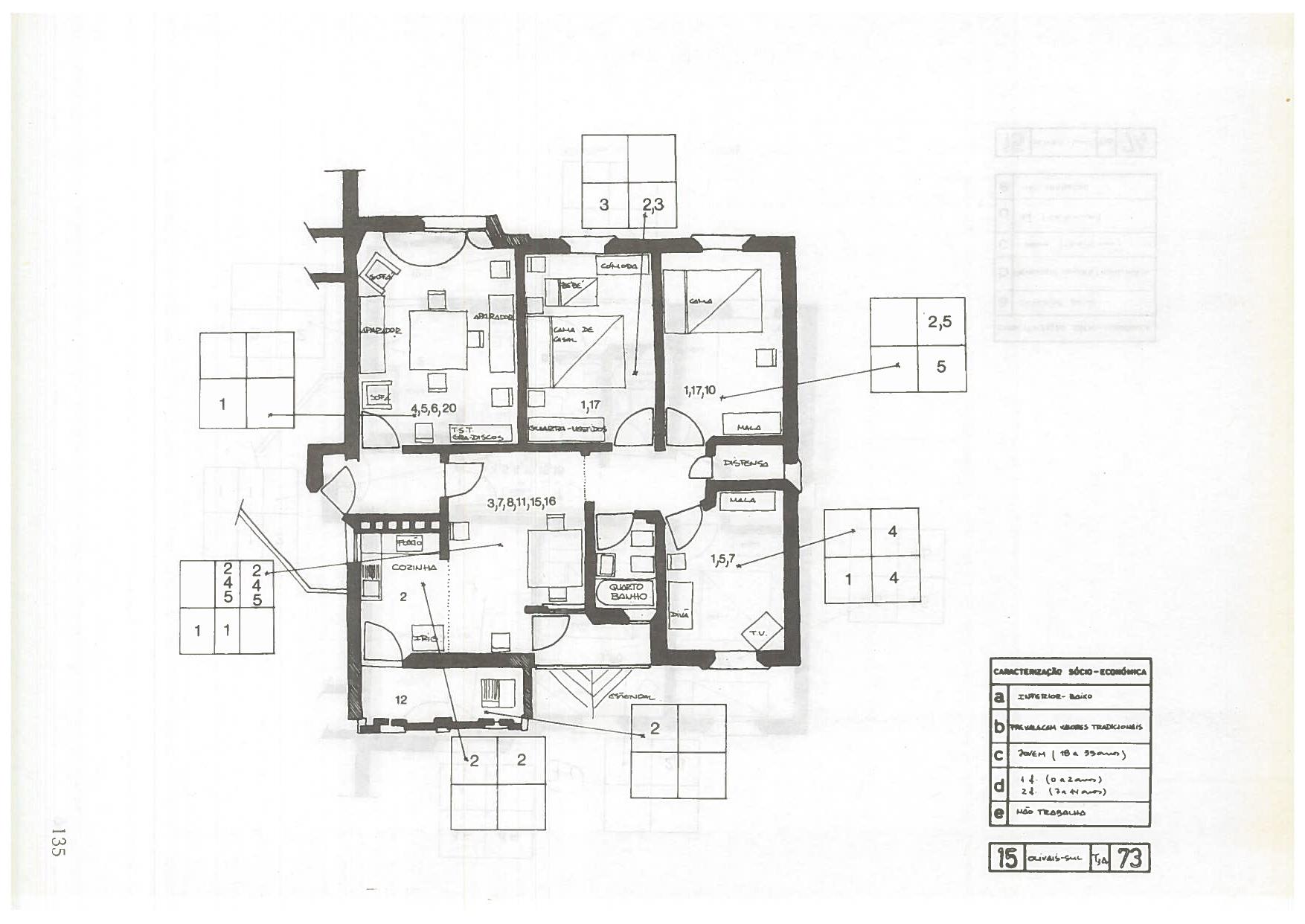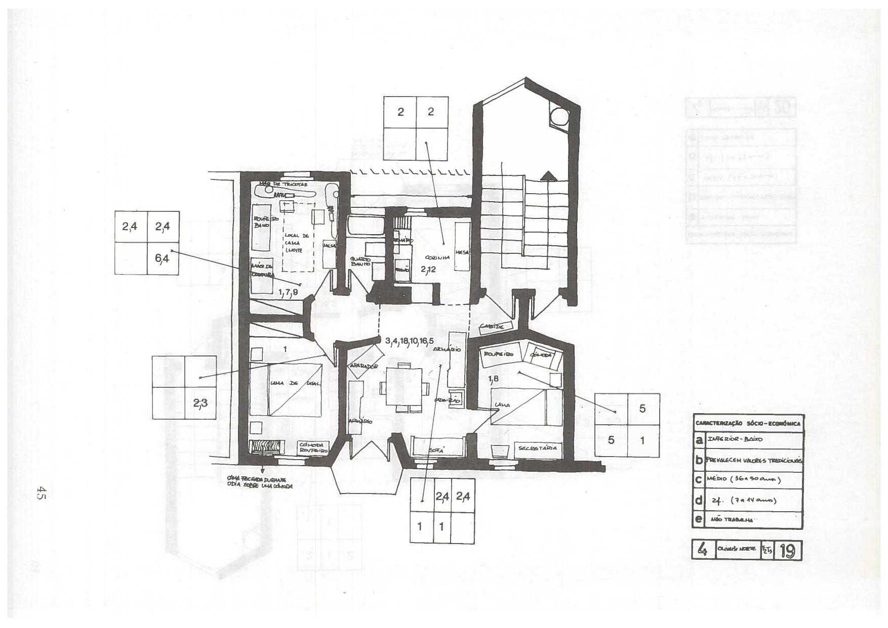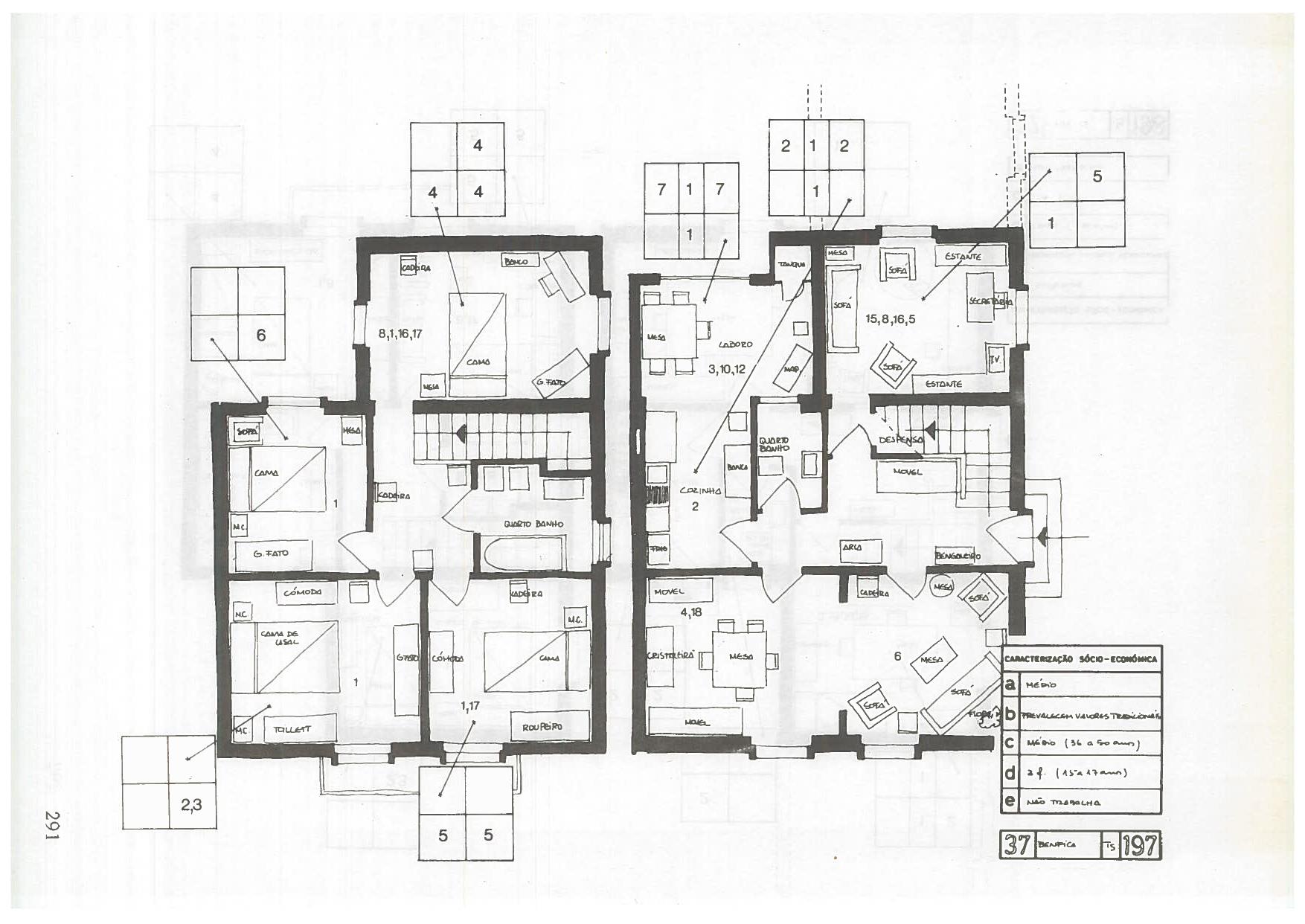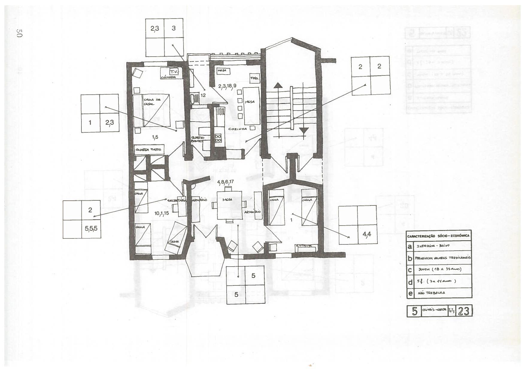A series of interpretative and quantitative questionnaires were conducted on 300 families. For each family, a plan was published in the survey, providing information on where domestic activities take place, and where and when household members are usually located in the house. The interior space was divided into rooms labelled according to a general function, such as kitchen, living room and bedrooms. For each family, the arrangement and disposition of furniture were registered. In each labelled room, it was represented which domestic activities took place, and which family members were usually present at the different times of day (defined as morning, lunch time, afternoon, evening and night).