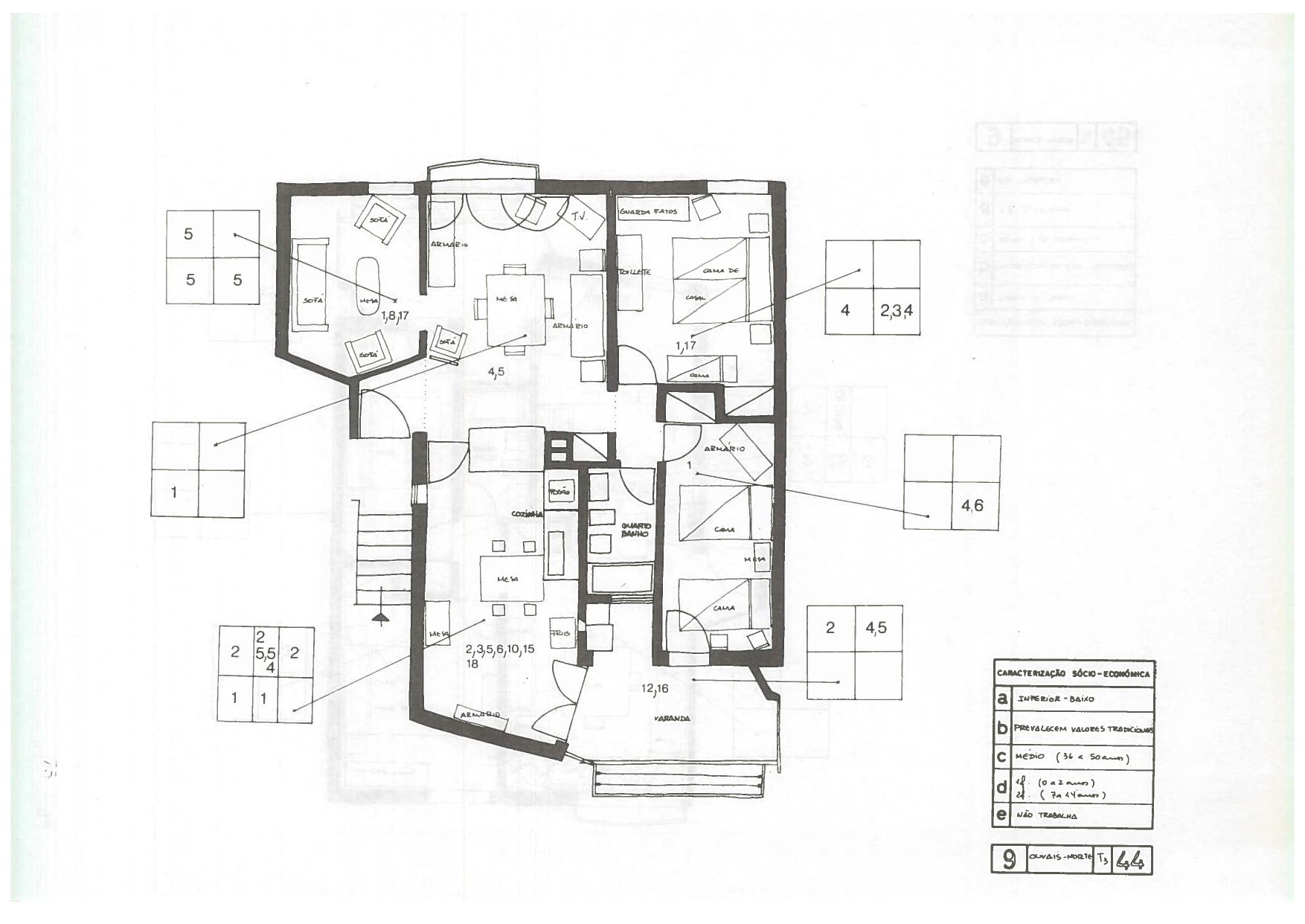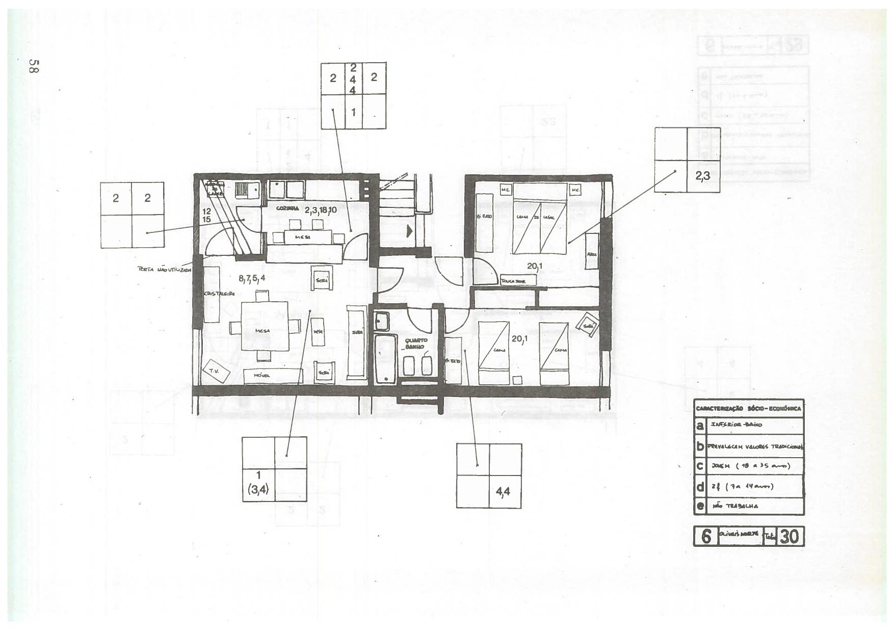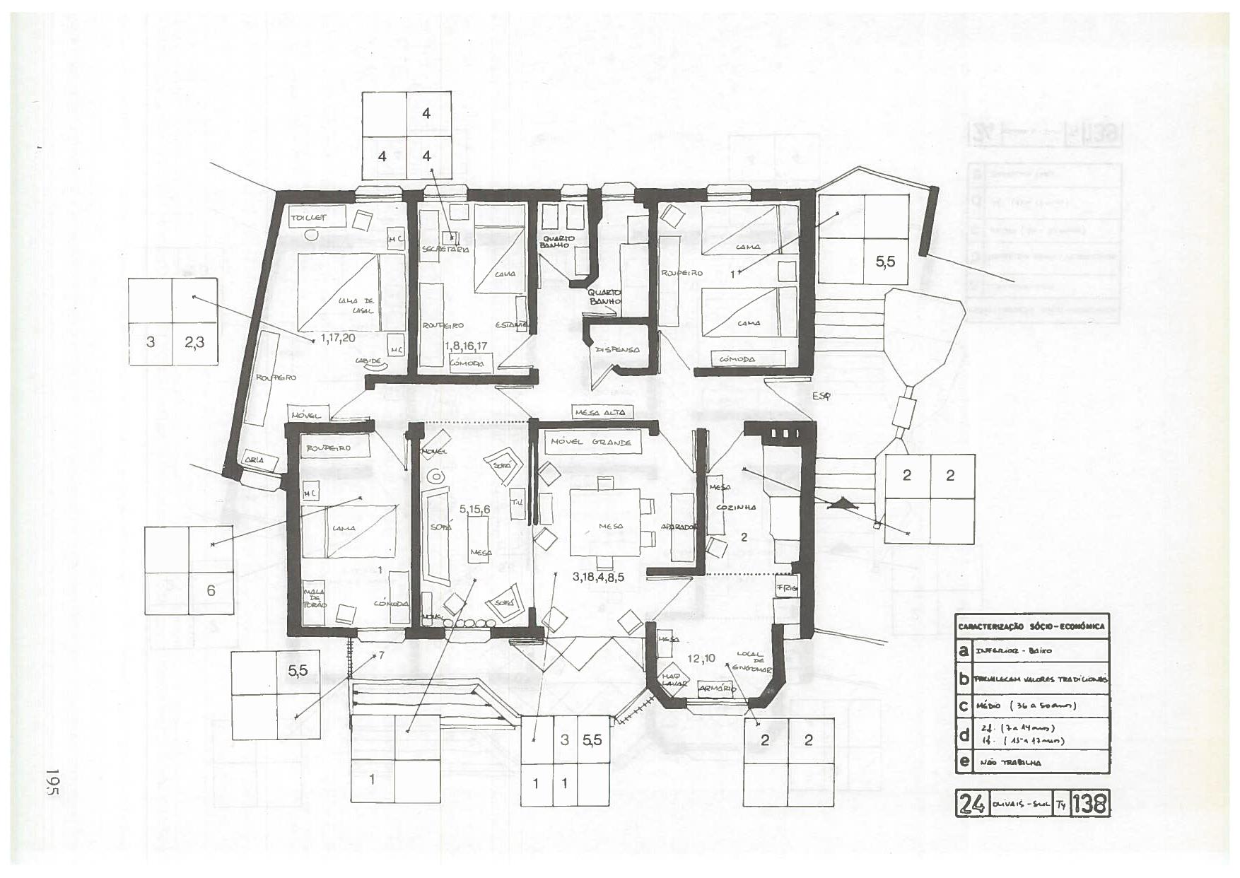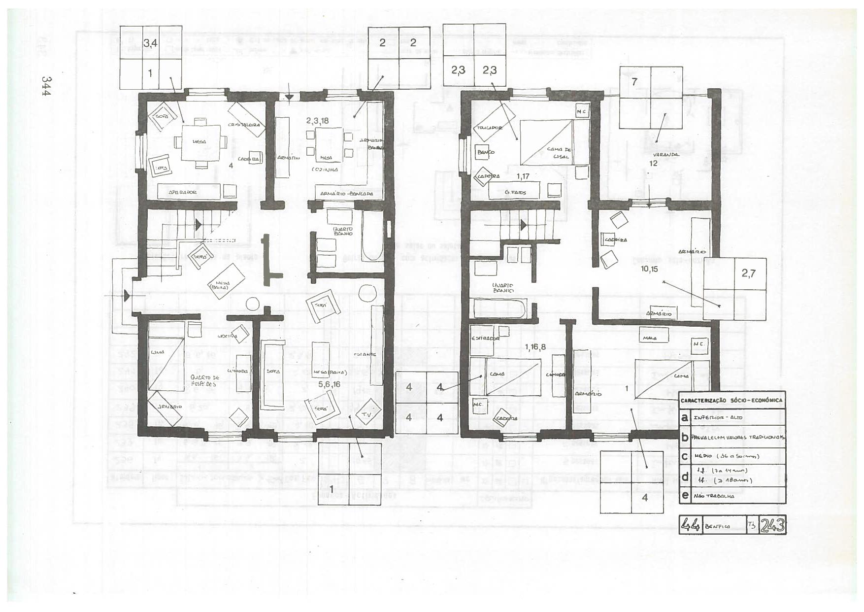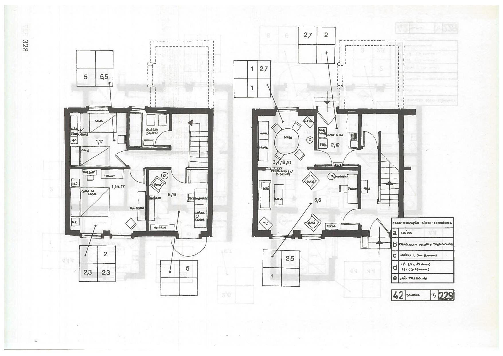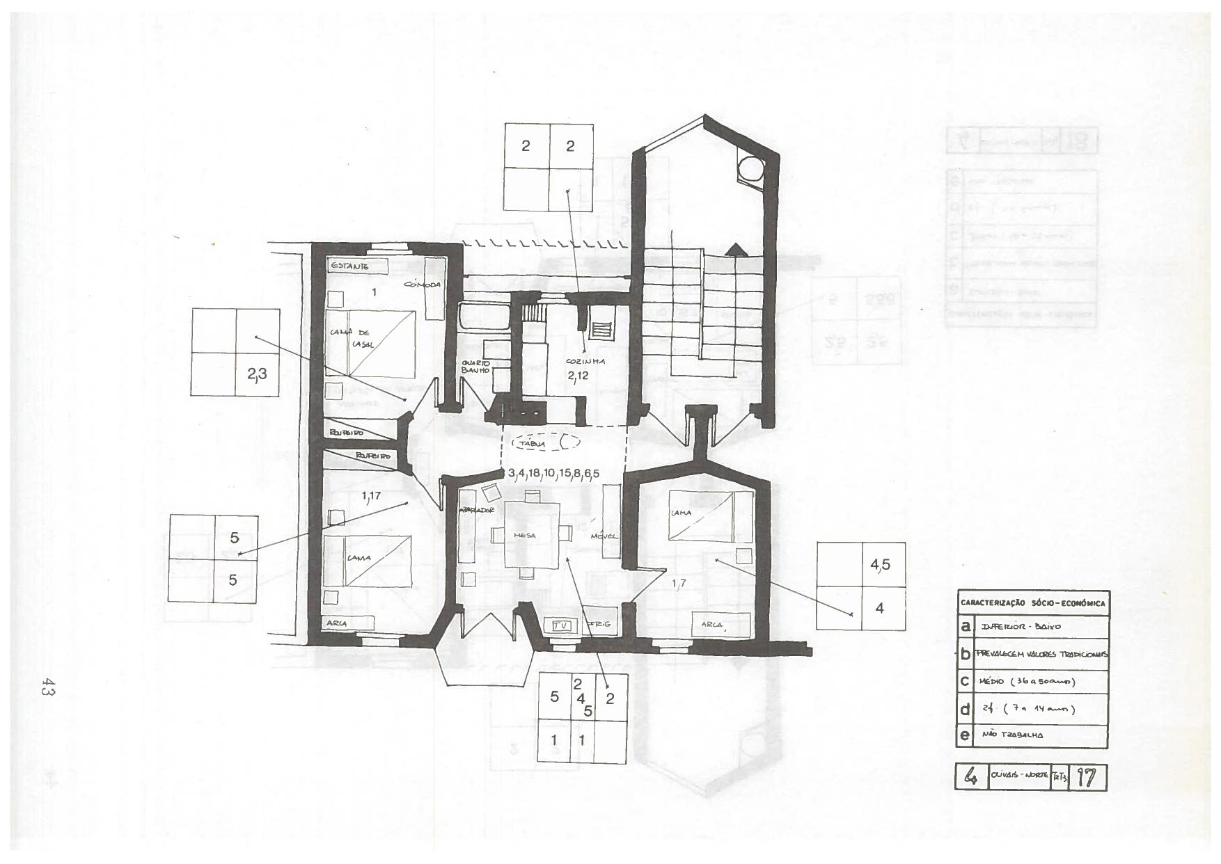 A series of interpretative and quantitative questionnaires were conducted on 300 families. For each family, a plan was published in the survey, providing information on where domestic activities take place, and where and when household members are usually located in the house. The interior space was divided into rooms labelled according to a general function, such as kitchen, living room and bedrooms. For each family, the arrangement and disposition of furniture were registered. In each labelled room, it was represented which domestic activities took place, and which family members were usually present at the different times of day (defined as morning, lunch time, afternoon, evening and night).