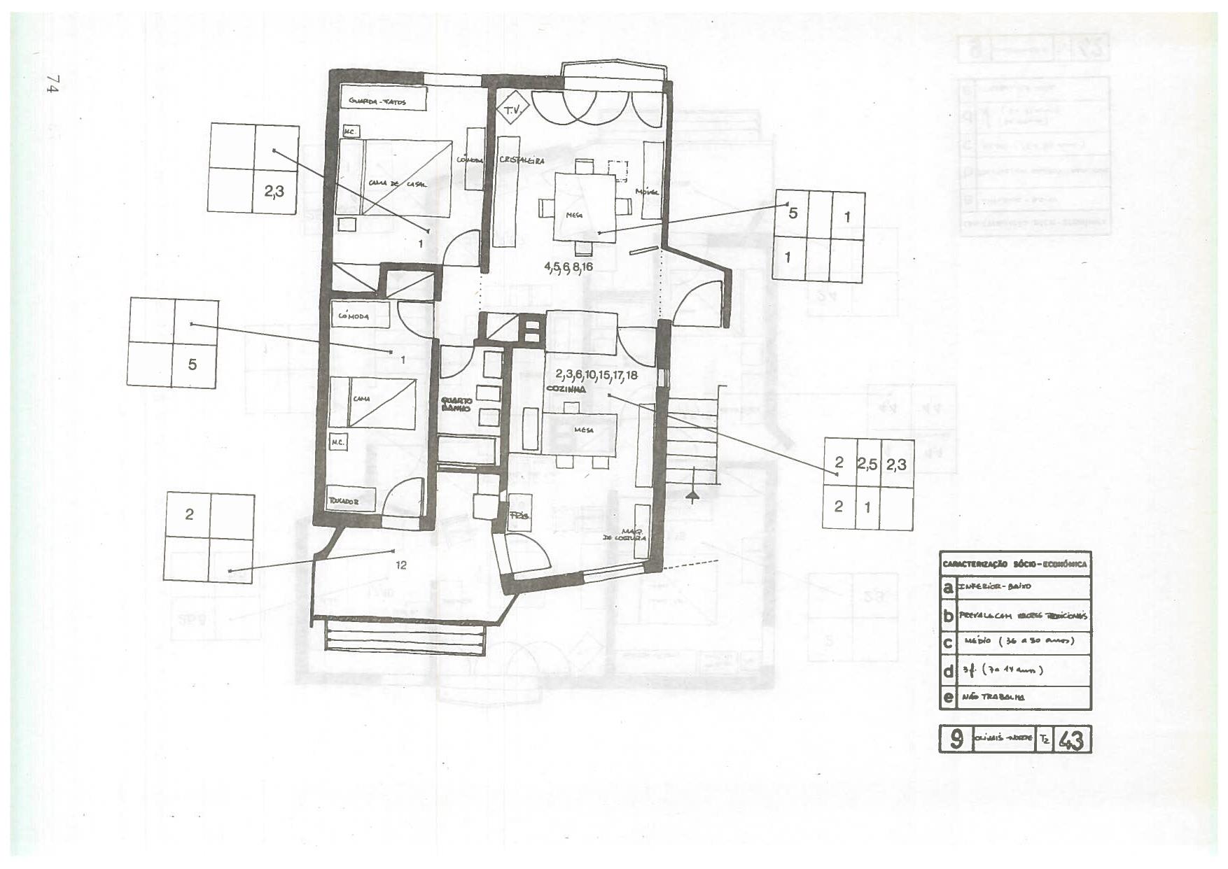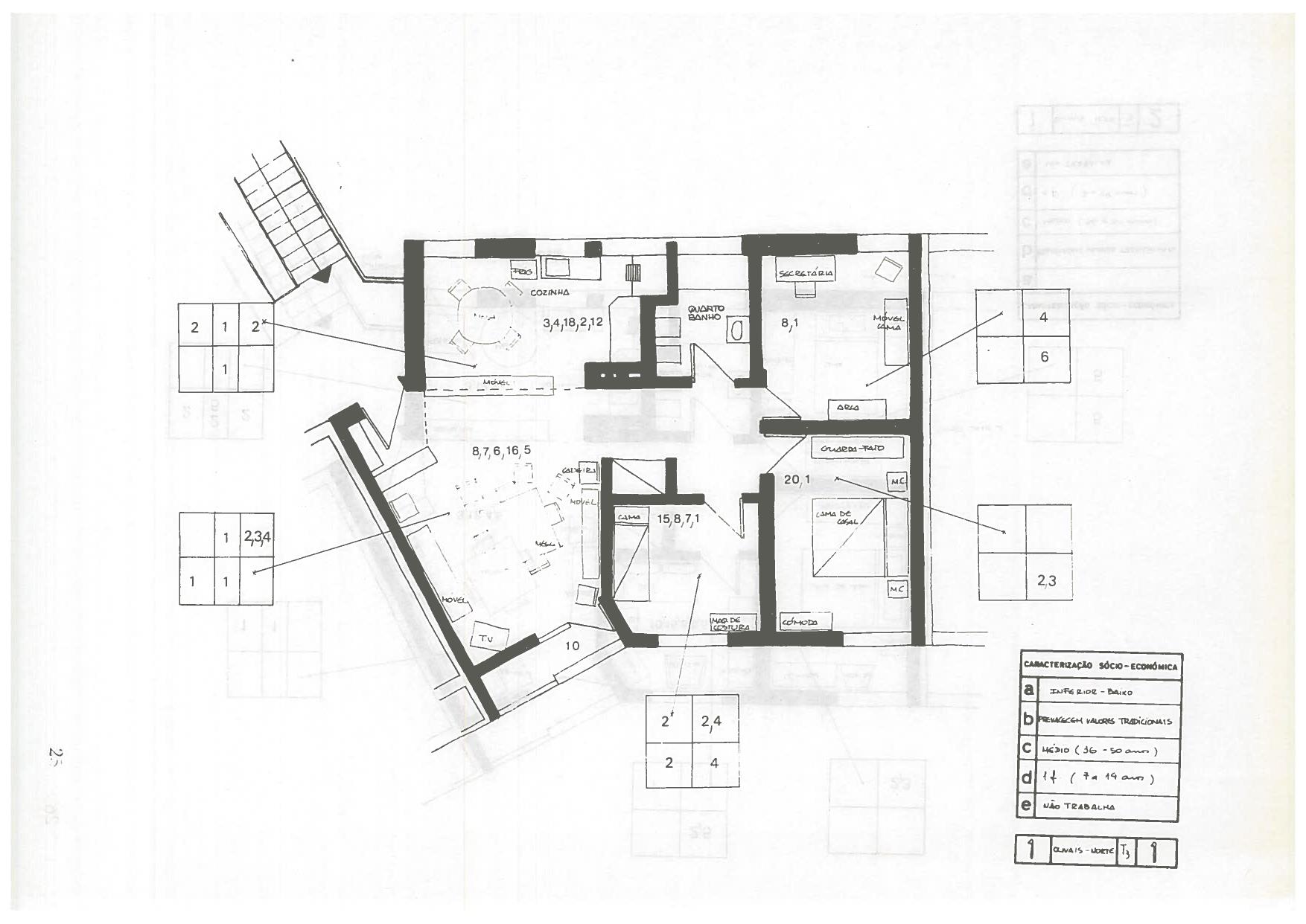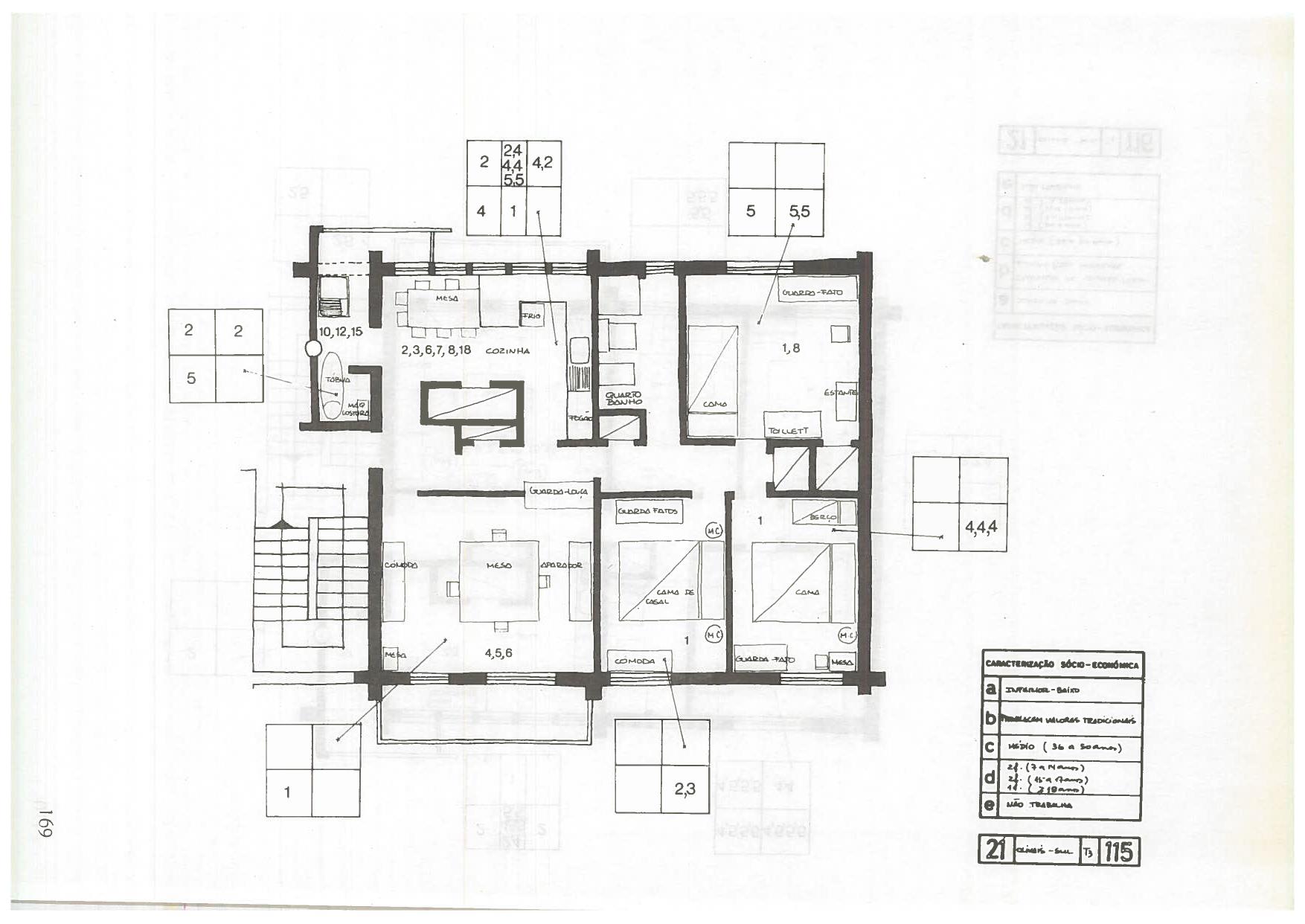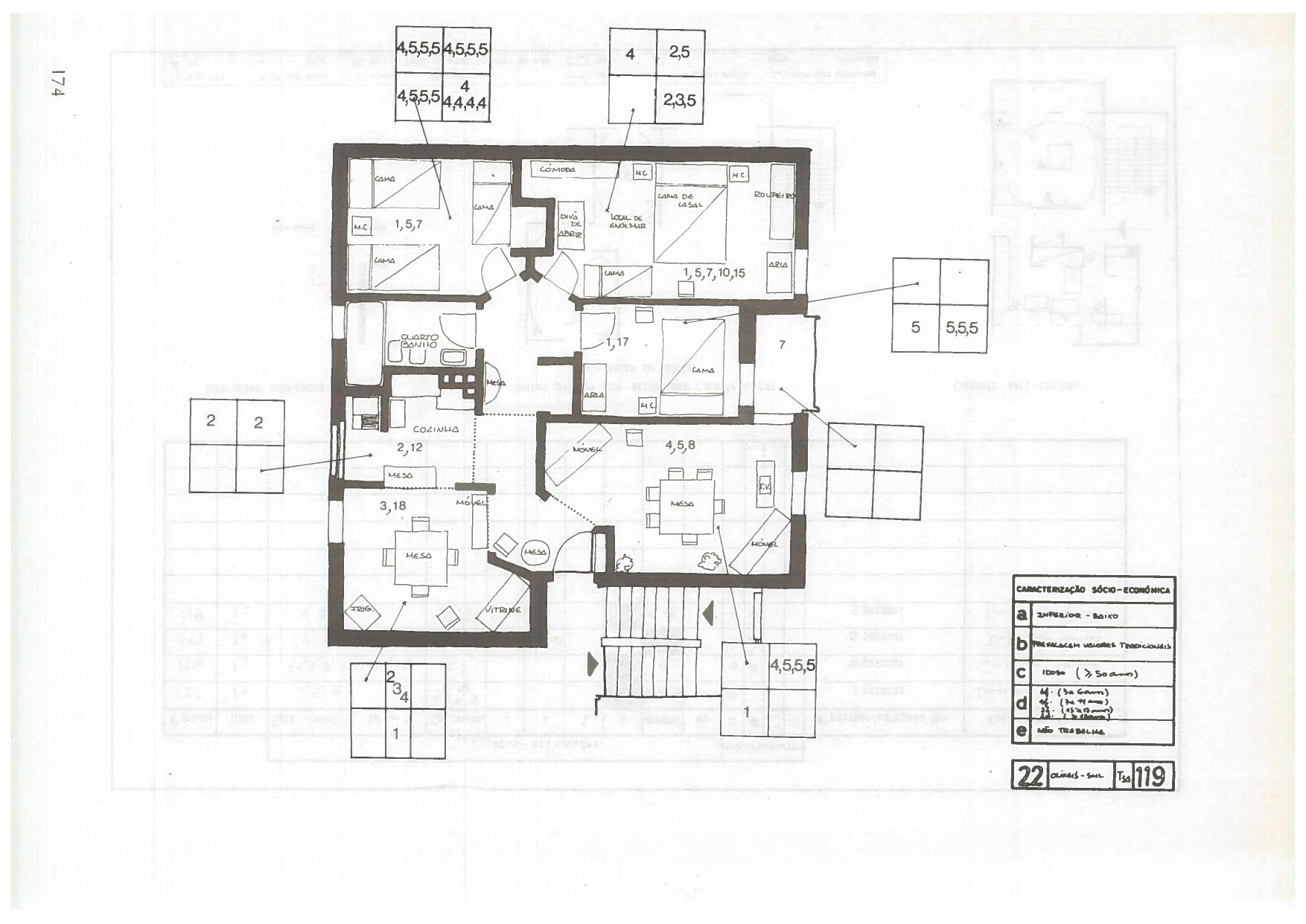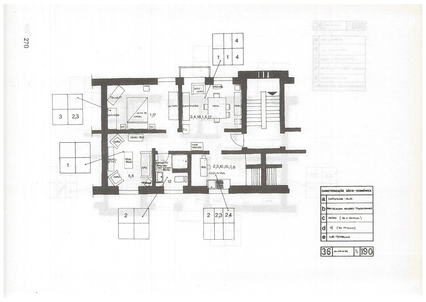 A series of interpretative and quantitative questionnaires were conducted on 300 families. For each family, a plan was published in the survey, providing information on where domestic activities take place, and where and when household members are usually located in the house. The interior space was divided into rooms labelled according to a general function, such as kitchen, living room and bedrooms. For each family, the arrangement and disposition of furniture were registered. In each labelled room, it was represented which domestic activities took place, and which family members were usually present at the different times of day (defined as morning, lunch time, afternoon, evening and night).