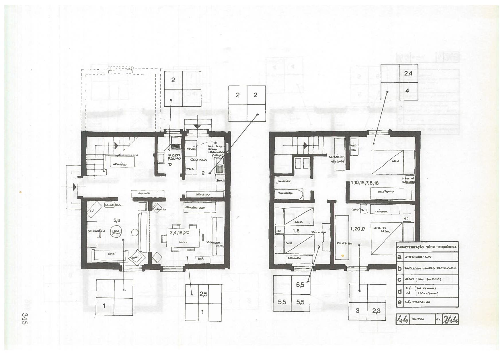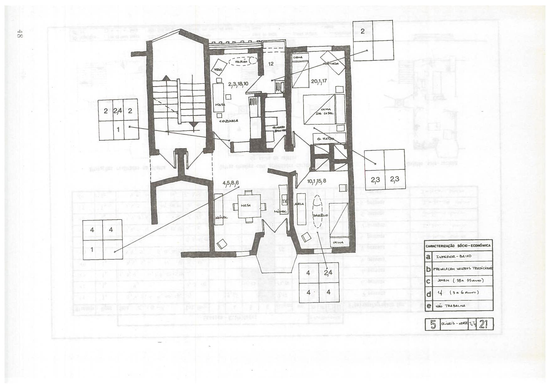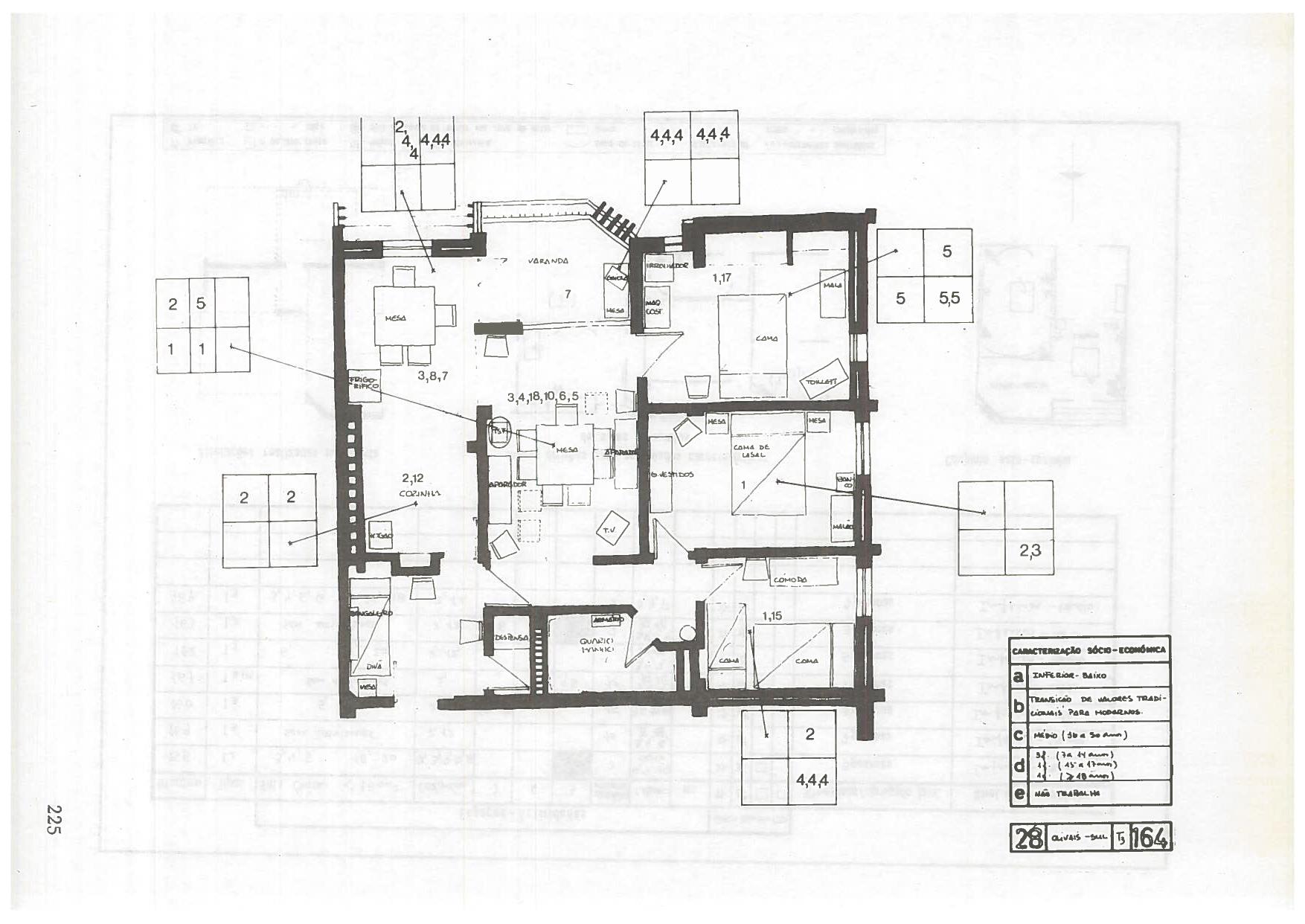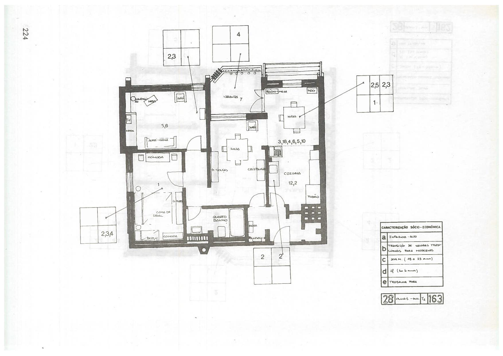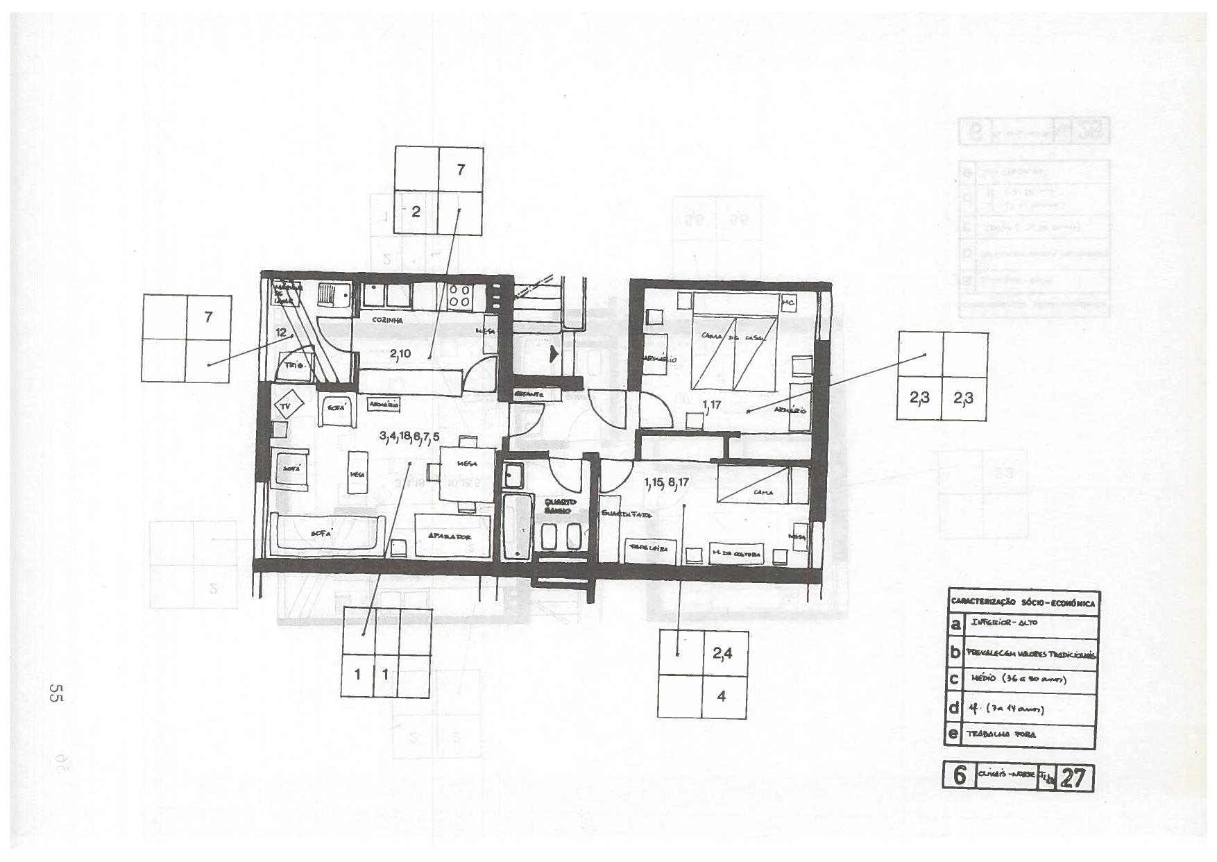 A series of interpretative and quantitative questionnaires were conducted on 300 families. For each family, a plan was published in the survey, providing information on where domestic activities take place, and where and when household members are usually located in the house. The interior space was divided into rooms labelled according to a general function, such as kitchen, living room and bedrooms. For each family, the arrangement and disposition of furniture were registered. In each labelled room, it was represented which domestic activities took place, and which family members were usually present at the different times of day (defined as morning, lunch time, afternoon, evening and night).