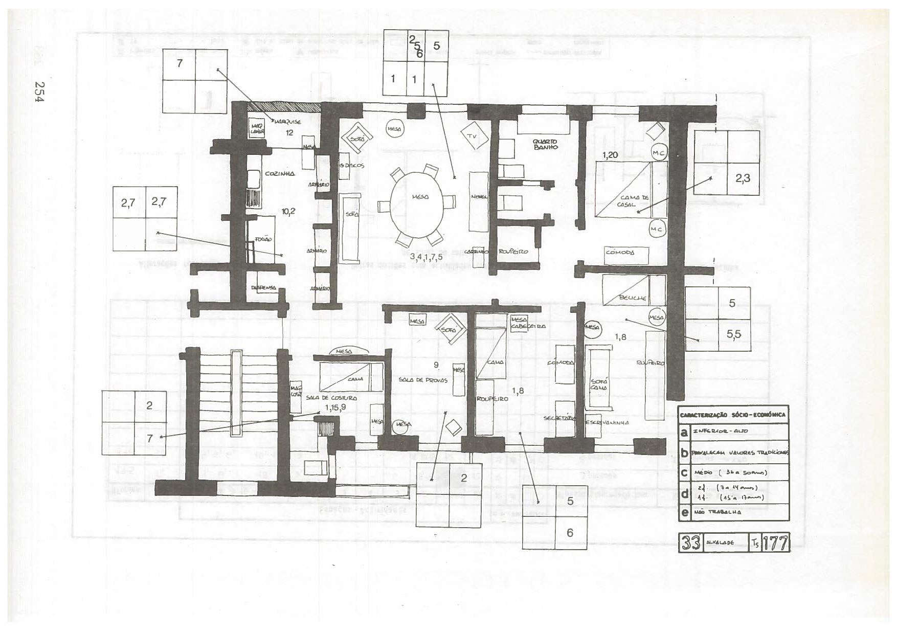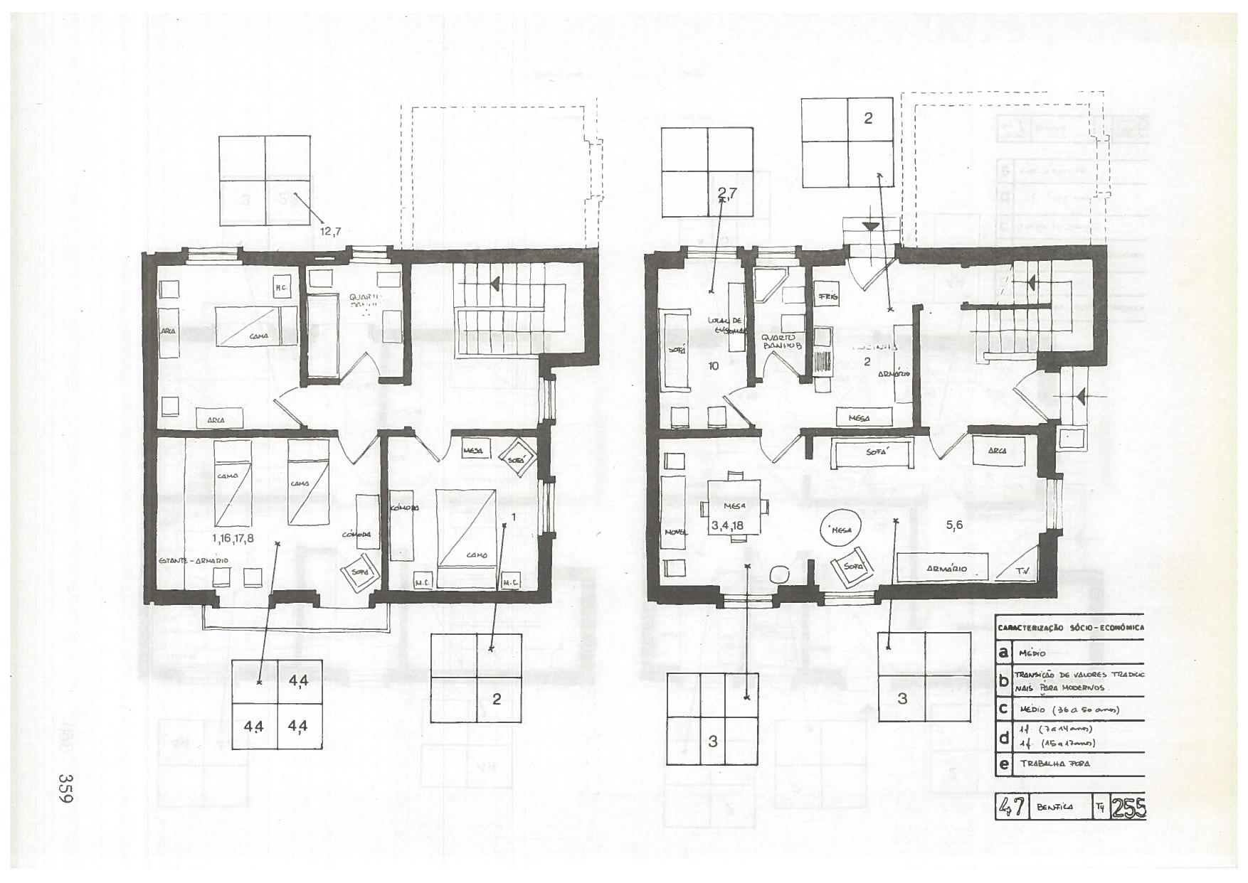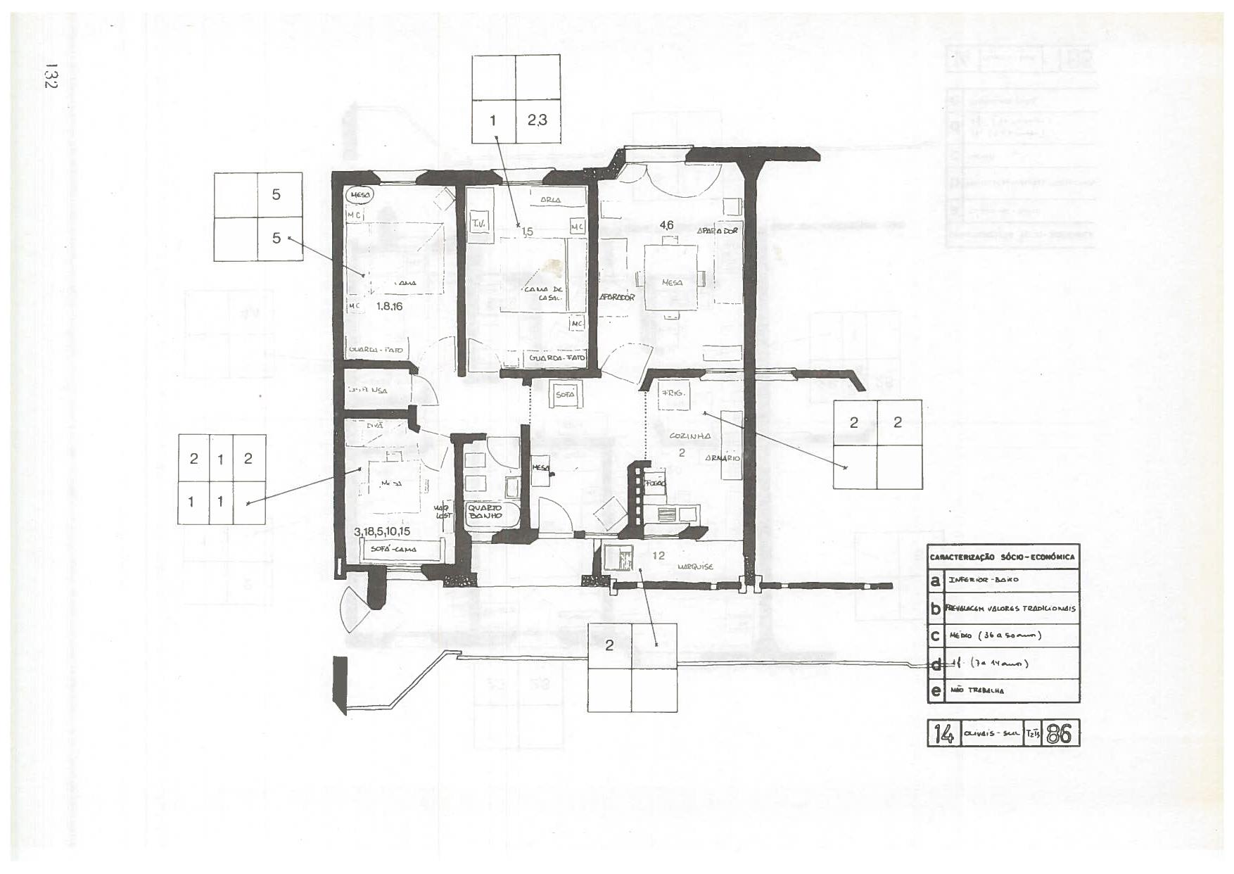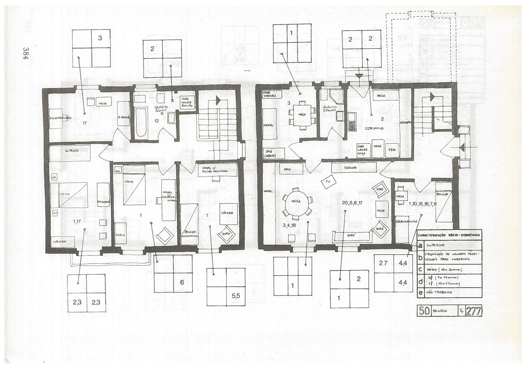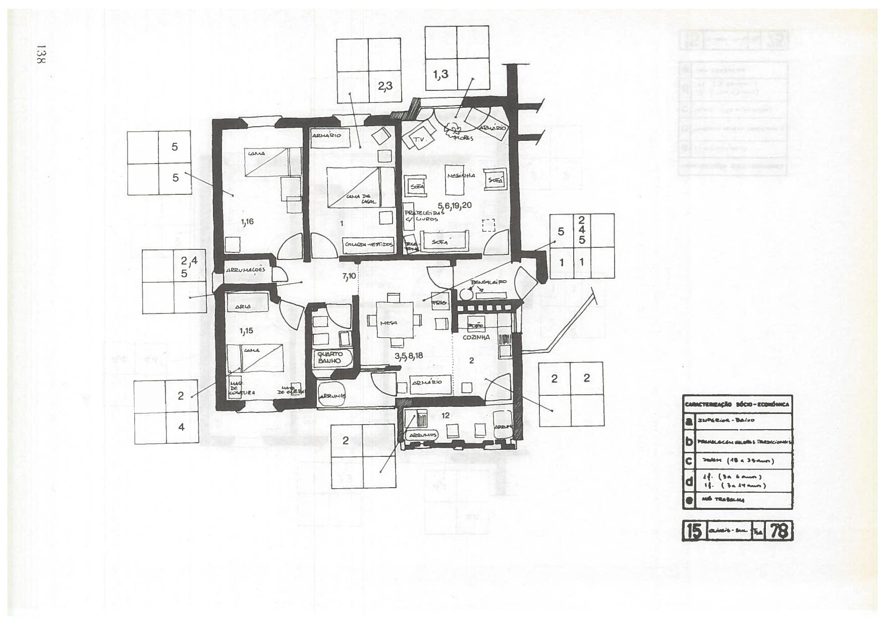 A series of interpretative and quantitative questionnaires were conducted on 300 families. For each family, a plan was published in the survey, providing information on where domestic activities take place, and where and when household members are usually located in the house. The interior space was divided into rooms labelled according to a general function, such as kitchen, living room and bedrooms. For each family, the arrangement and disposition of furniture were registered. In each labelled room, it was represented which domestic activities took place, and which family members were usually present at the different times of day (defined as morning, lunch time, afternoon, evening and night).