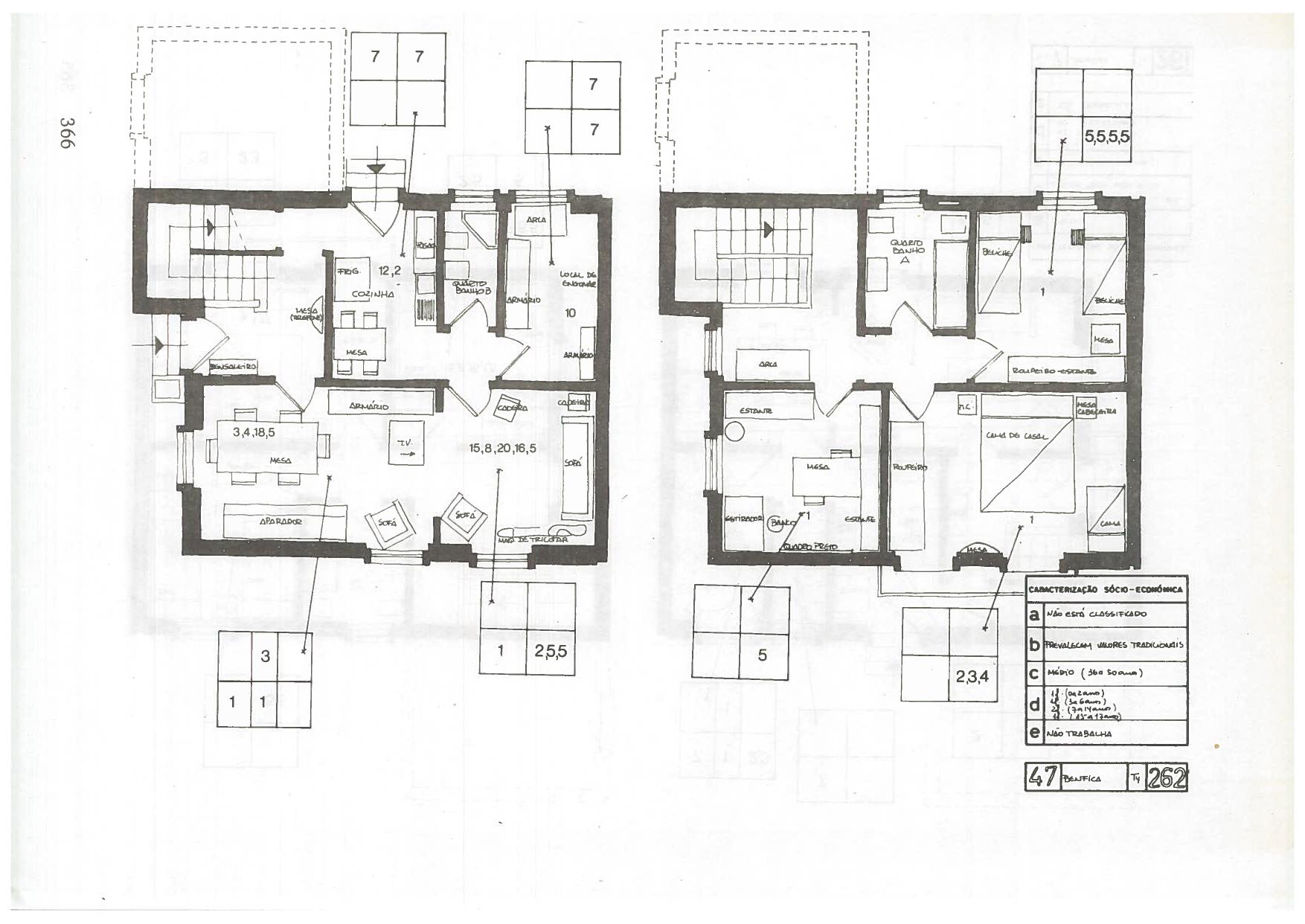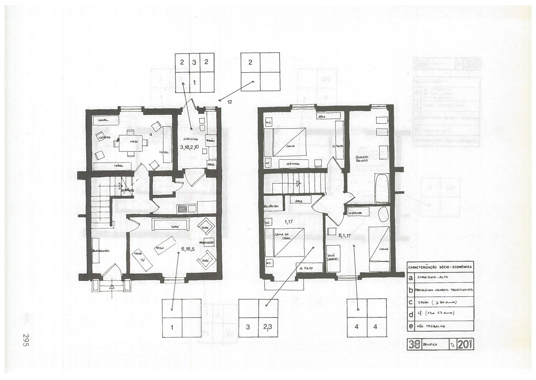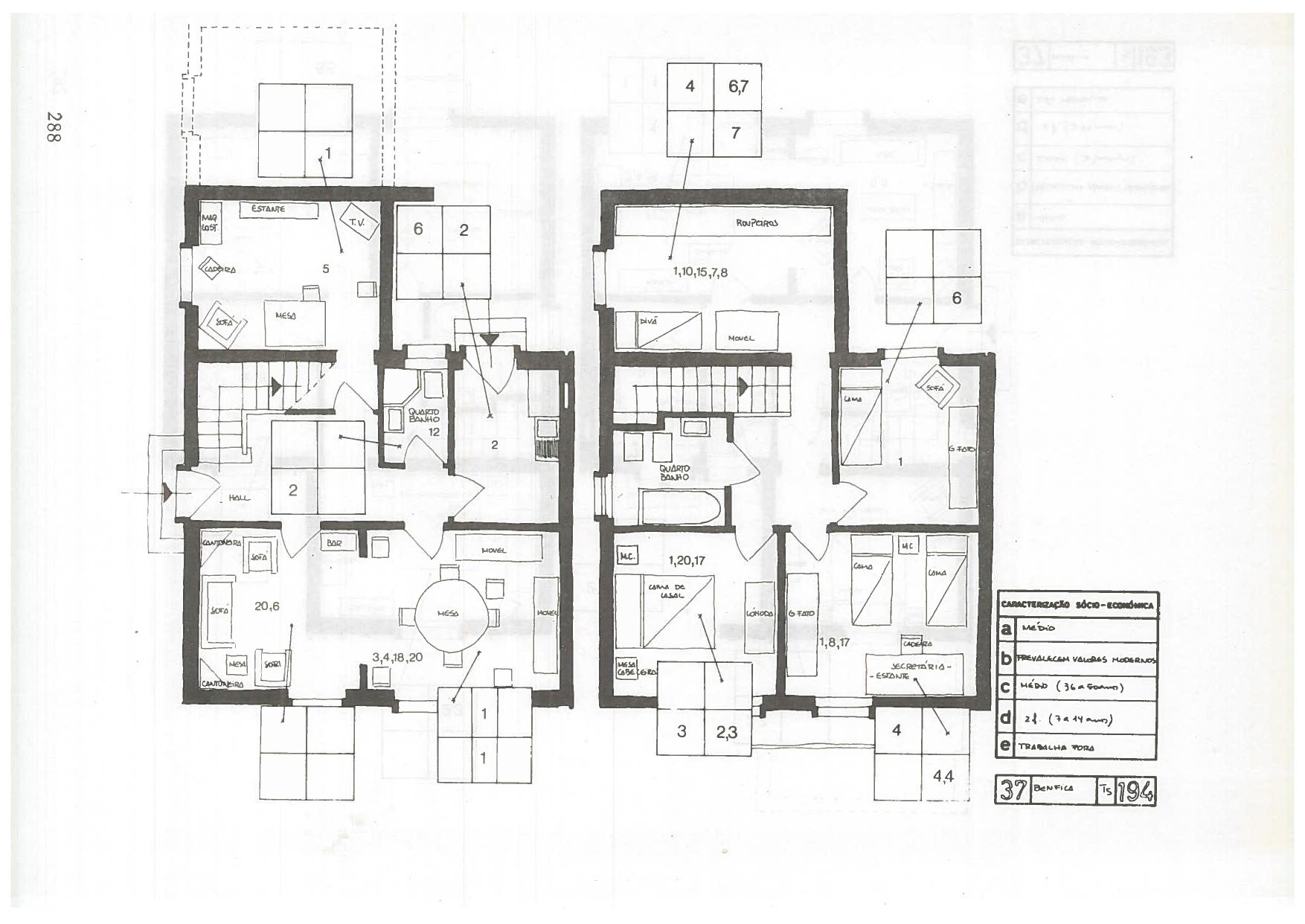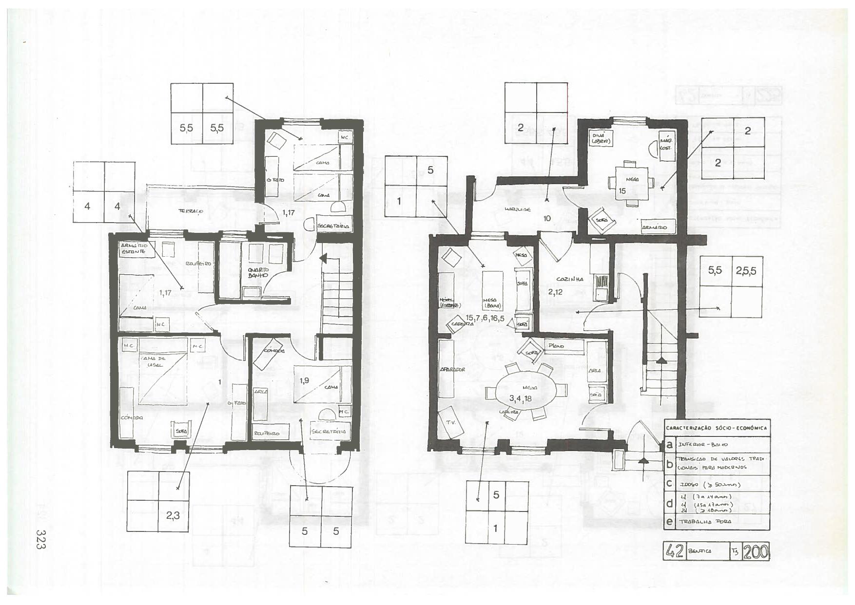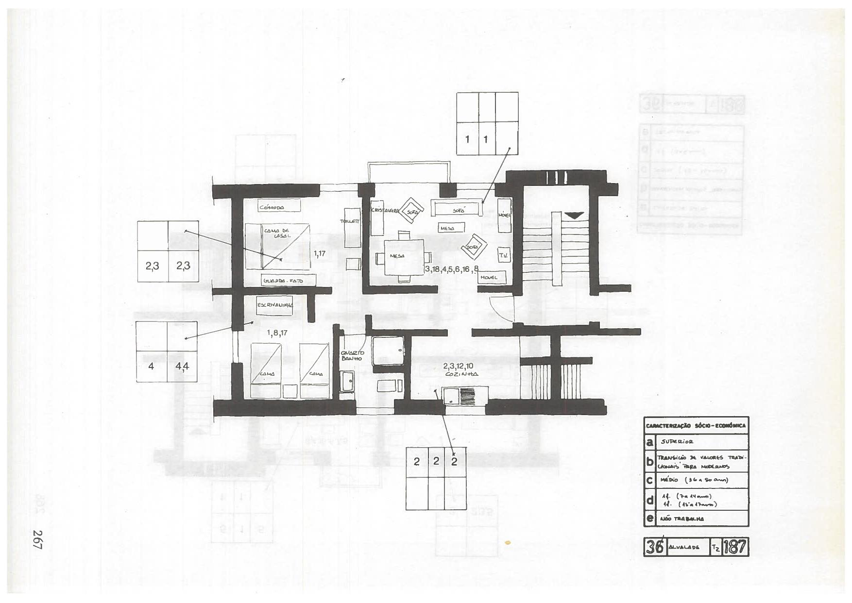A series of interpretative and quantitative questionnaires were conducted on 300 families. For each family, a plan was published in the survey, providing information on where domestic activities take place, and where and when household members are usually located in the house. The interior space was divided into rooms labelled according to a general function, such as kitchen, living room and bedrooms. For each family, the arrangement and disposition of furniture were registered. In each labelled room, it was represented which domestic activities took place, and which family members were usually present at the different times of day (defined as morning, lunch time, afternoon, evening and night).