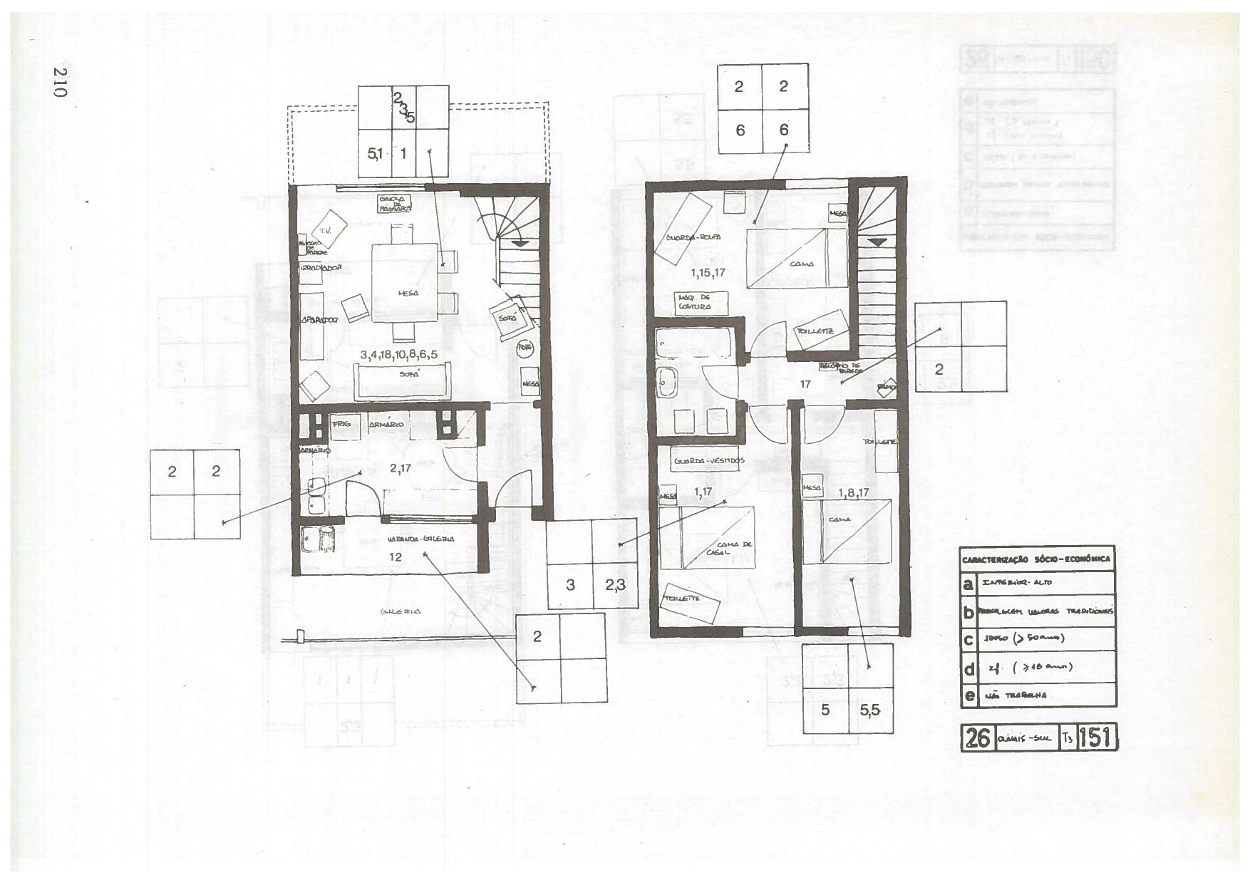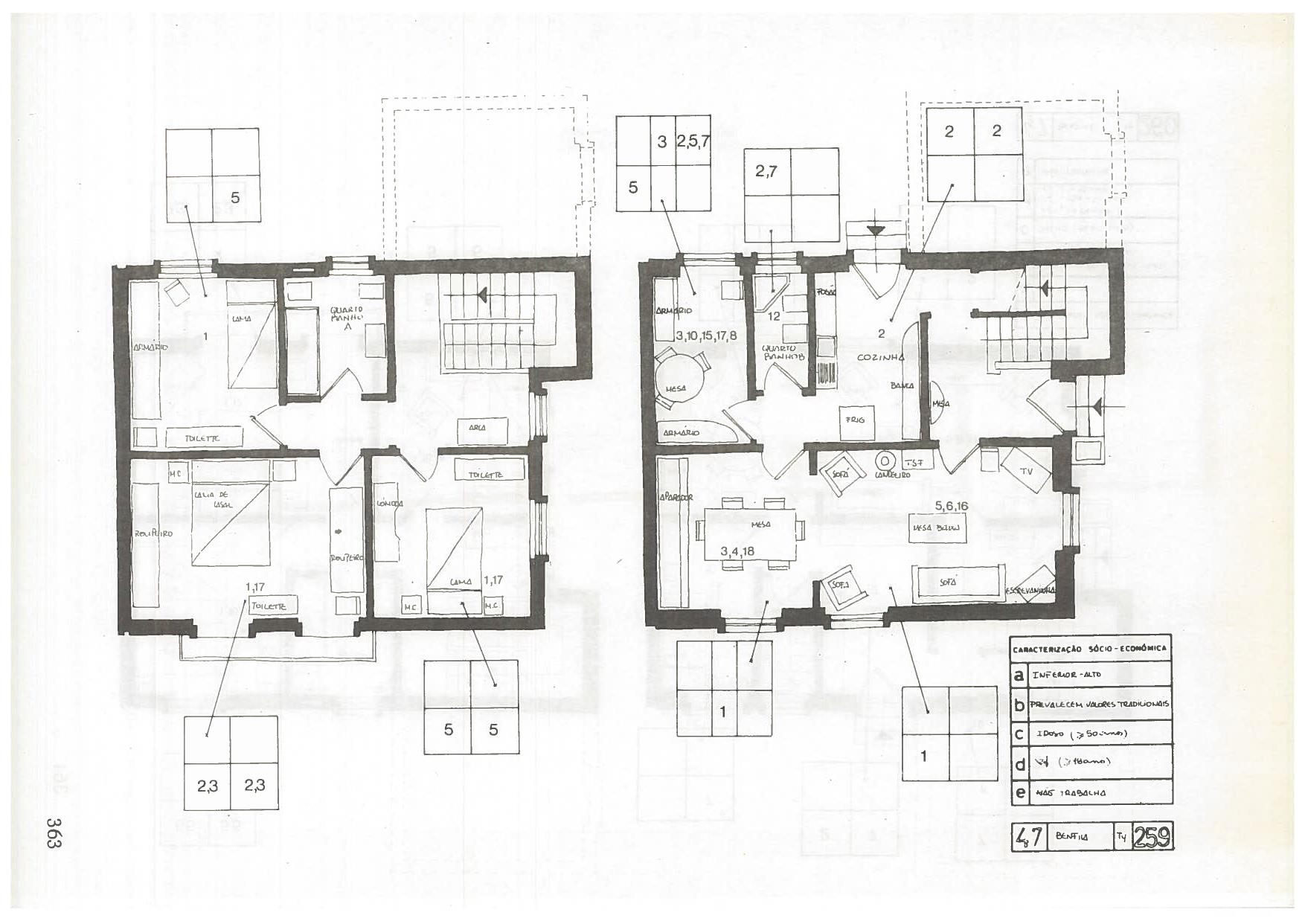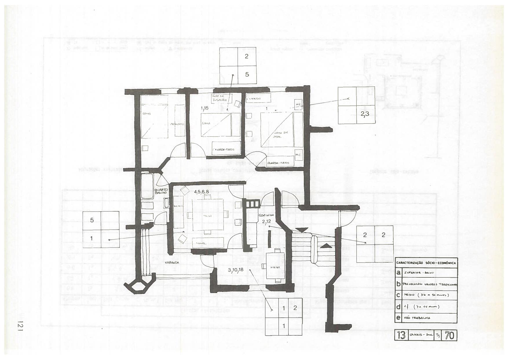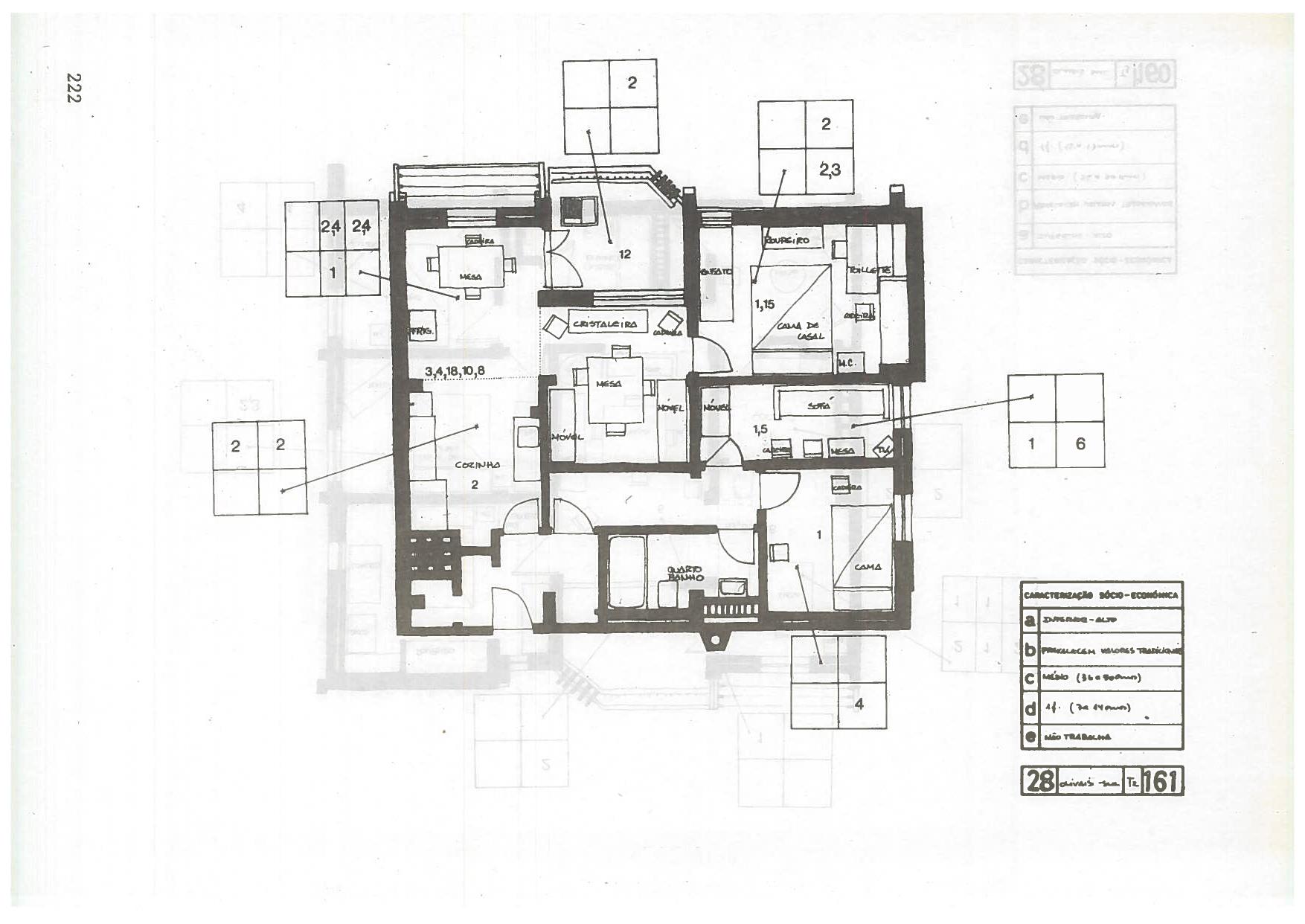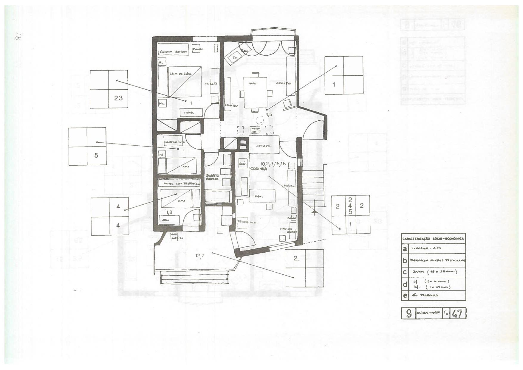 A series of interpretative and quantitative questionnaires were conducted on 300 families. For each family, a plan was published in the survey, providing information on where domestic activities take place, and where and when household members are usually located in the house. The interior space was divided into rooms labelled according to a general function, such as kitchen, living room and bedrooms. For each family, the arrangement and disposition of furniture were registered. In each labelled room, it was represented which domestic activities took place, and which family members were usually present at the different times of day (defined as morning, lunch time, afternoon, evening and night).