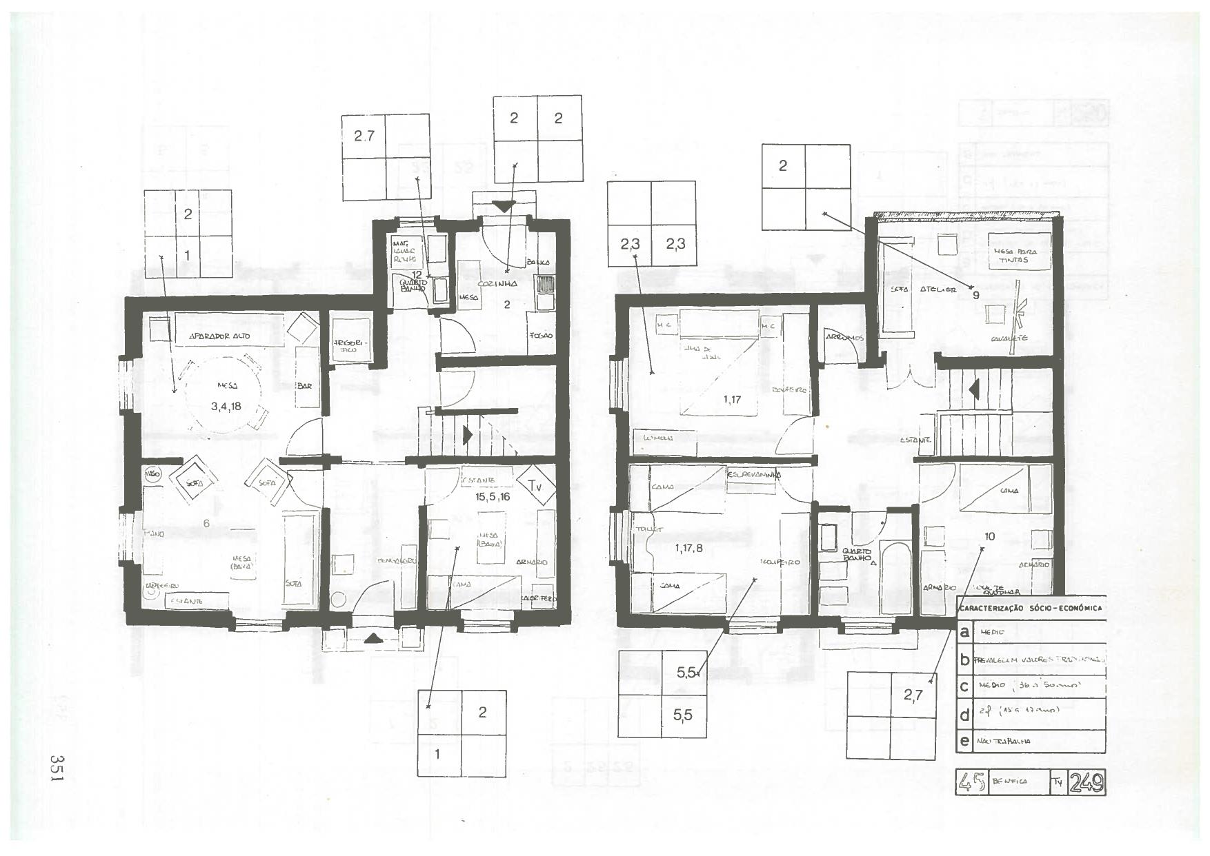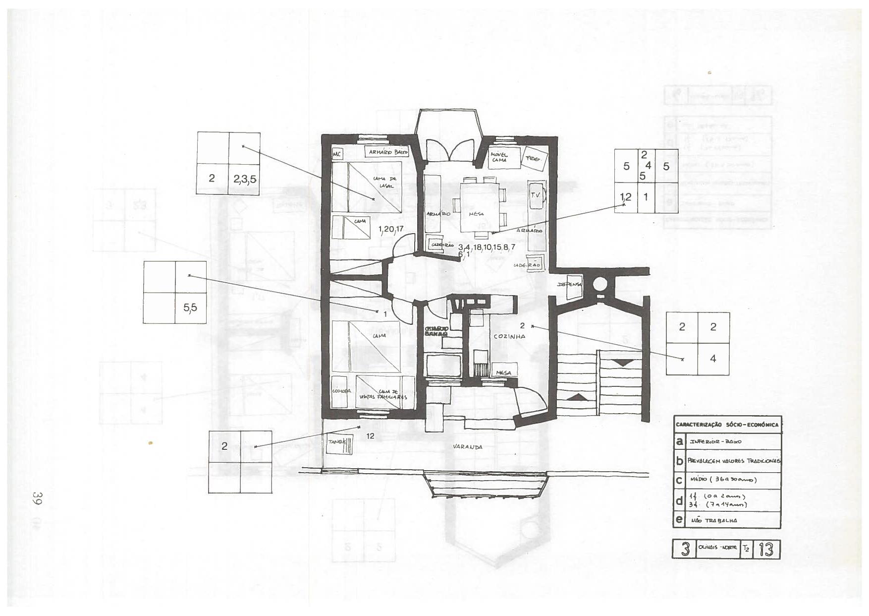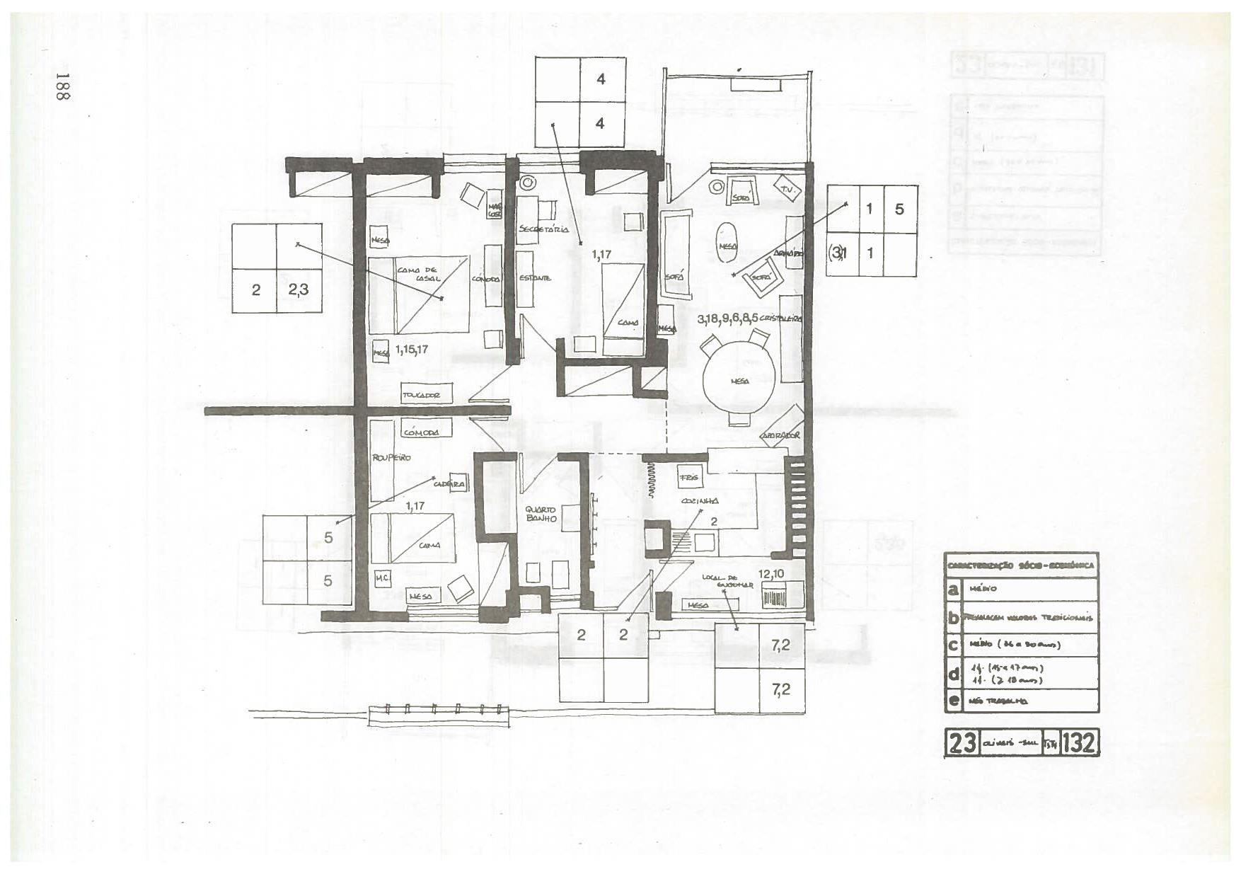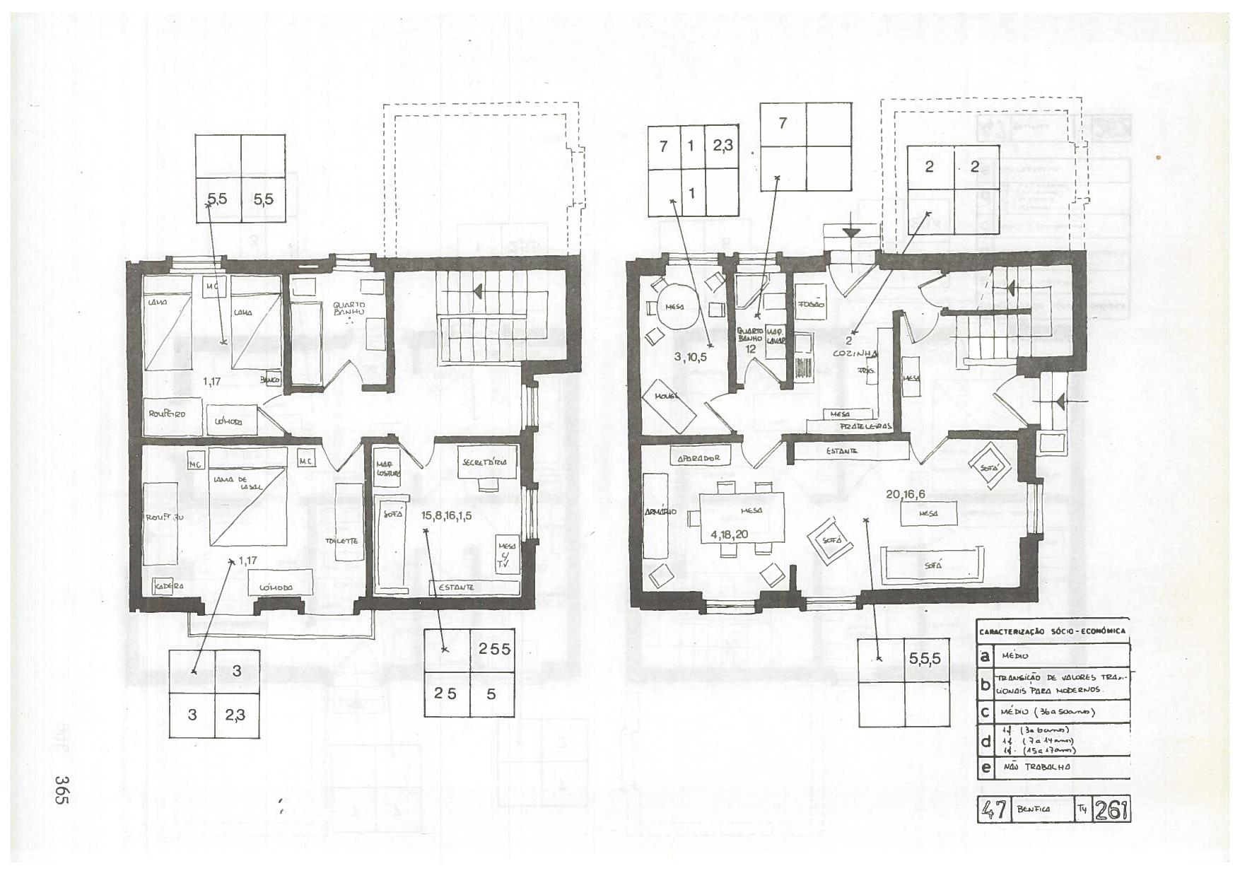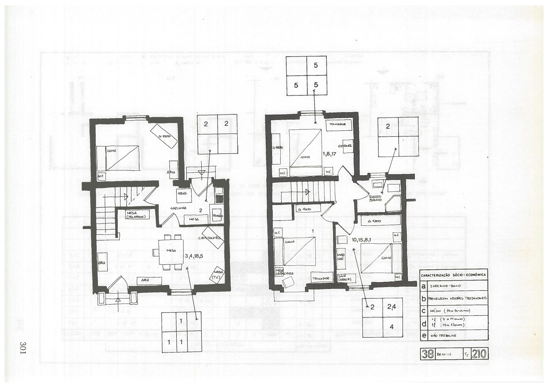 A series of interpretative and quantitative questionnaires were conducted on 300 families. For each family, a plan was published in the survey, providing information on where domestic activities take place, and where and when household members are usually located in the house. The interior space was divided into rooms labelled according to a general function, such as kitchen, living room and bedrooms. For each family, the arrangement and disposition of furniture were registered. In each labelled room, it was represented which domestic activities took place, and which family members were usually present at the different times of day (defined as morning, lunch time, afternoon, evening and night).