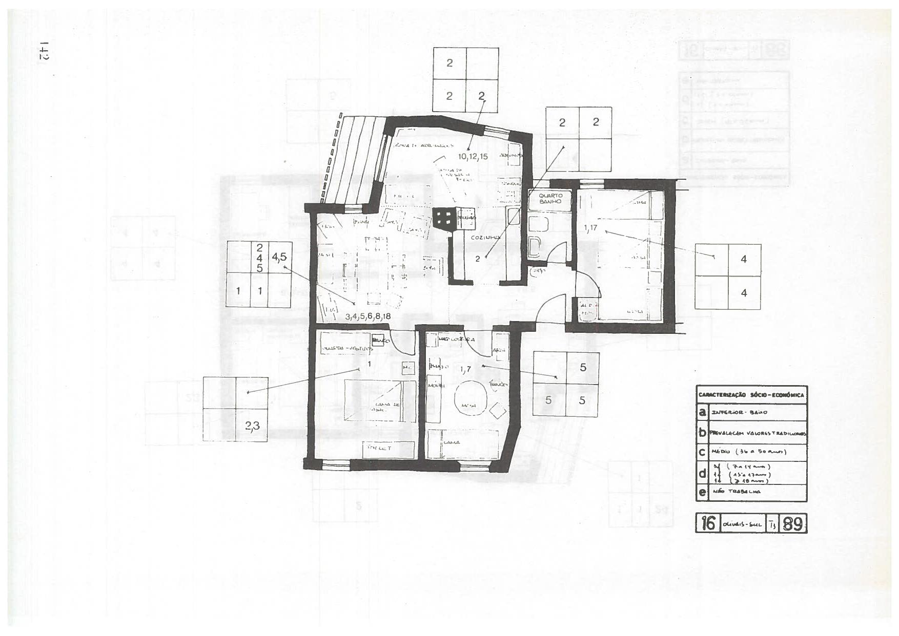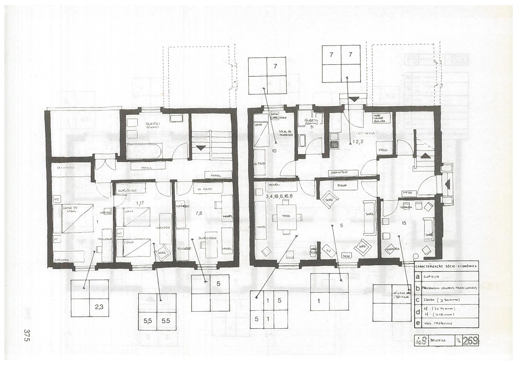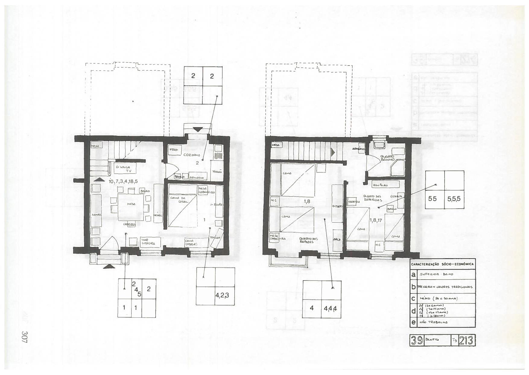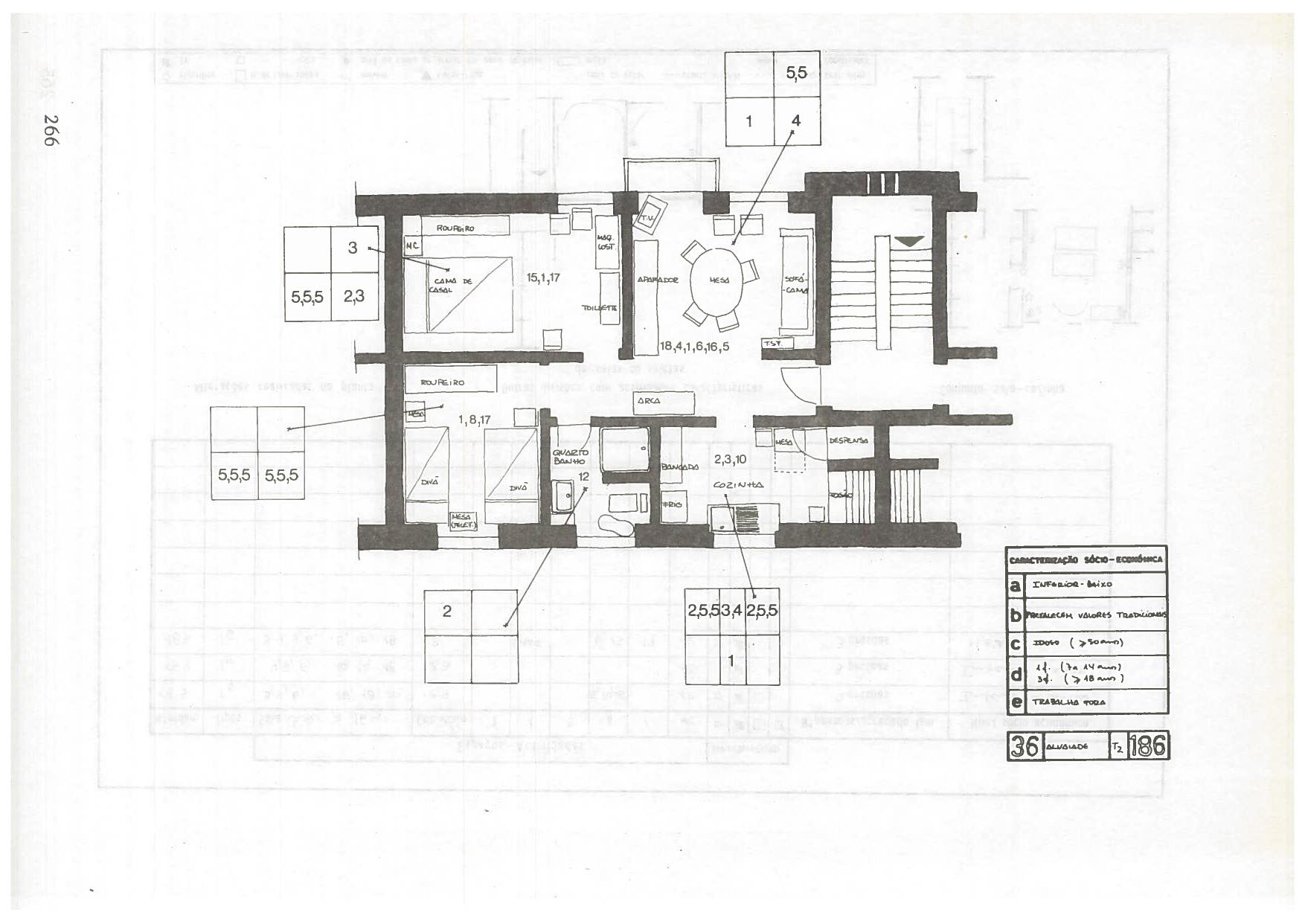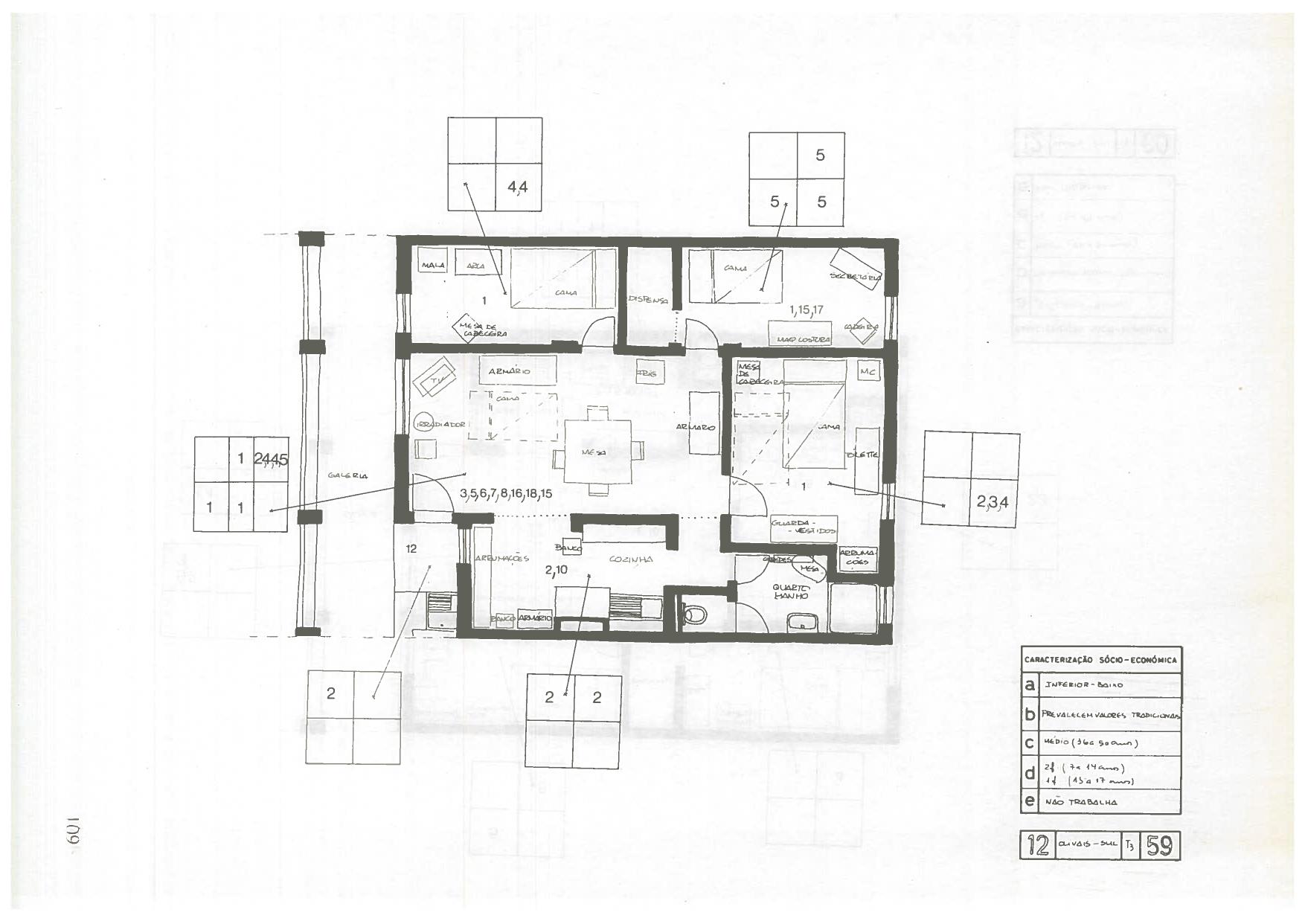 A series of interpretative and quantitative questionnaires were conducted on 300 families. For each family, a plan was published in the survey, providing information on where domestic activities take place, and where and when household members are usually located in the house. The interior space was divided into rooms labelled according to a general function, such as kitchen, living room and bedrooms. For each family, the arrangement and disposition of furniture were registered. In each labelled room, it was represented which domestic activities took place, and which family members were usually present at the different times of day (defined as morning, lunch time, afternoon, evening and night).