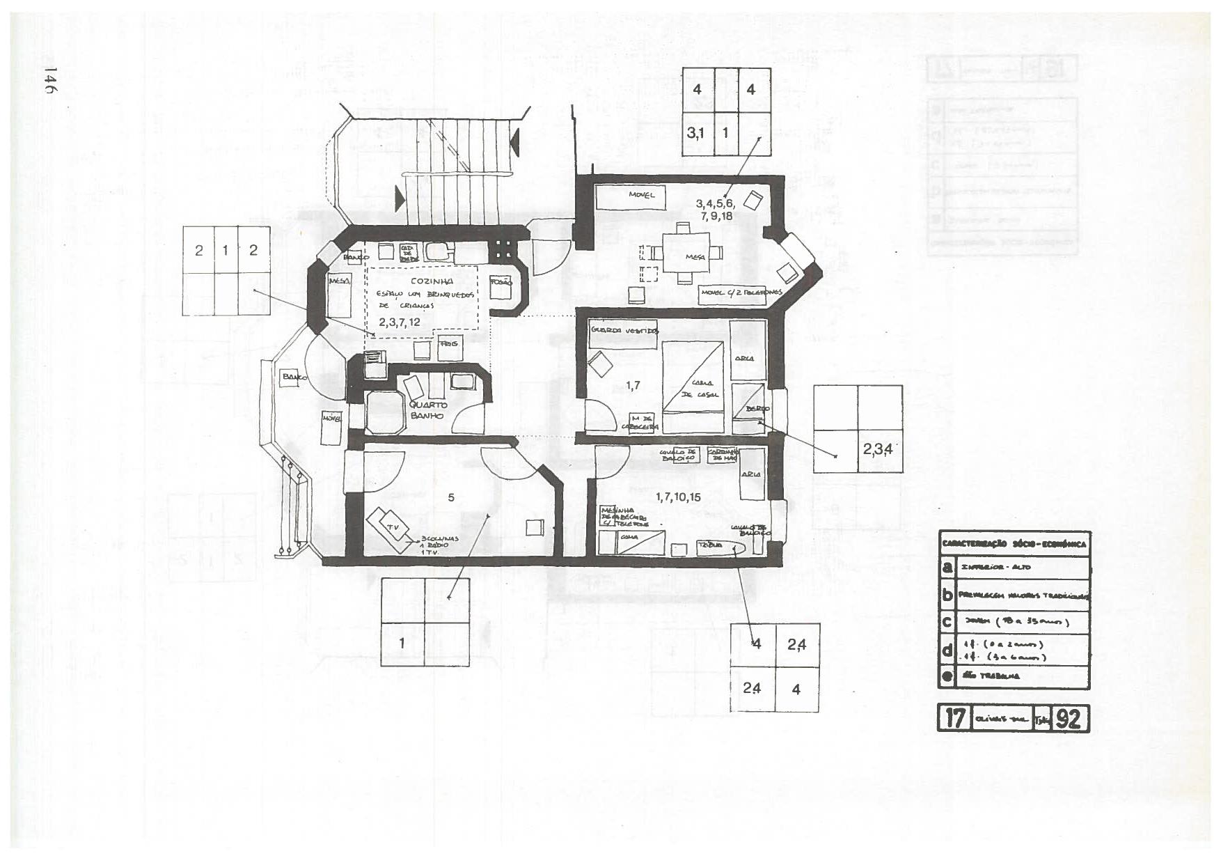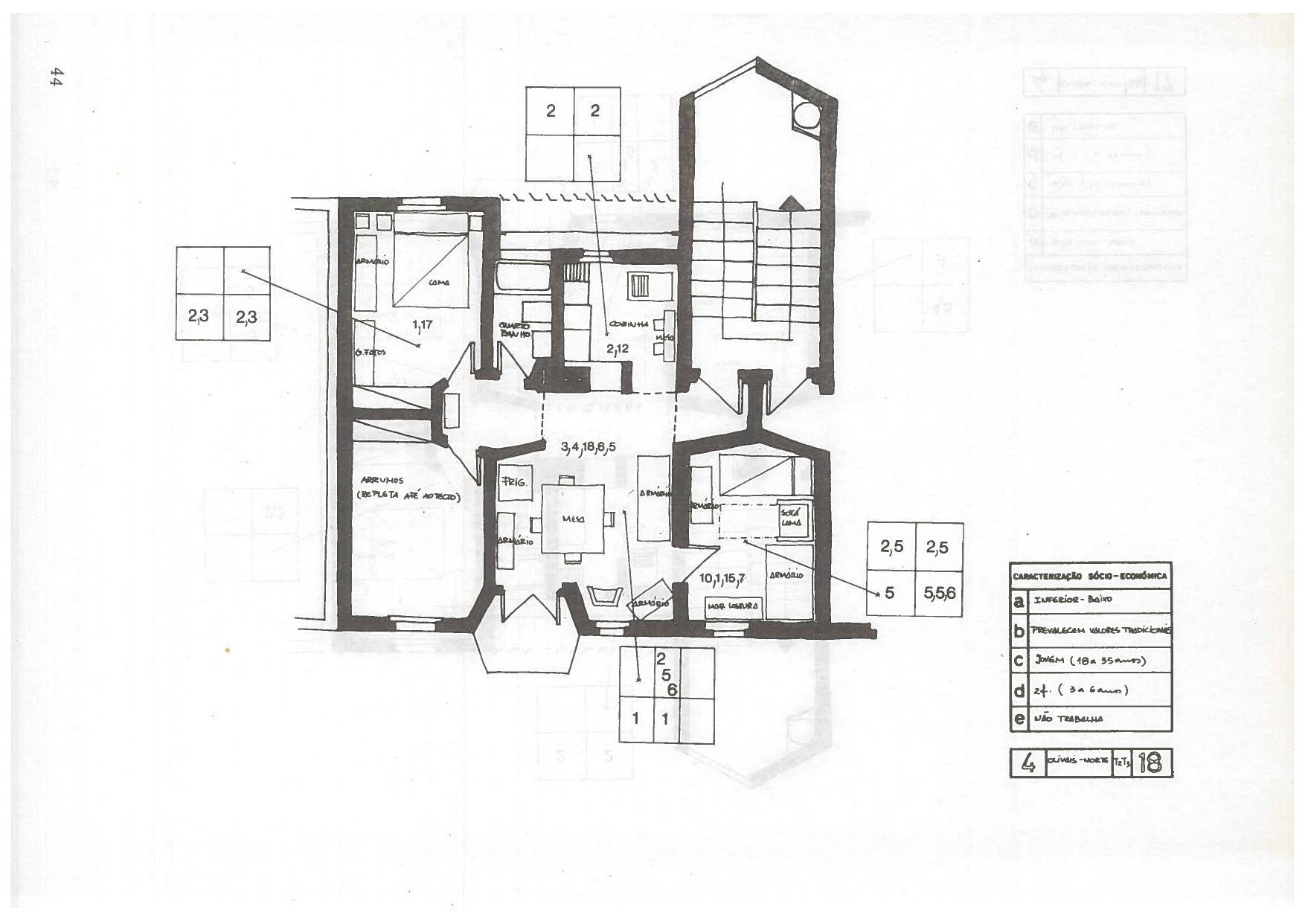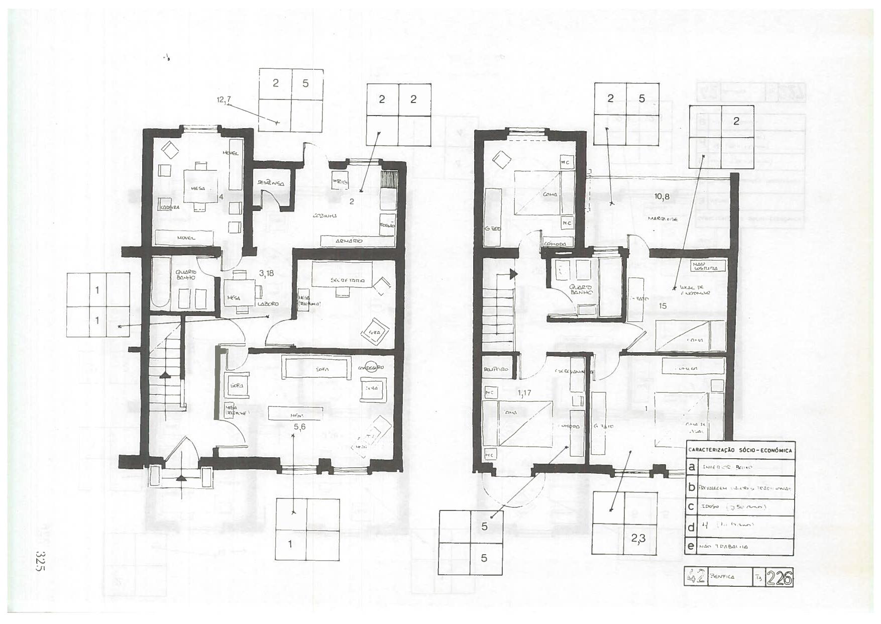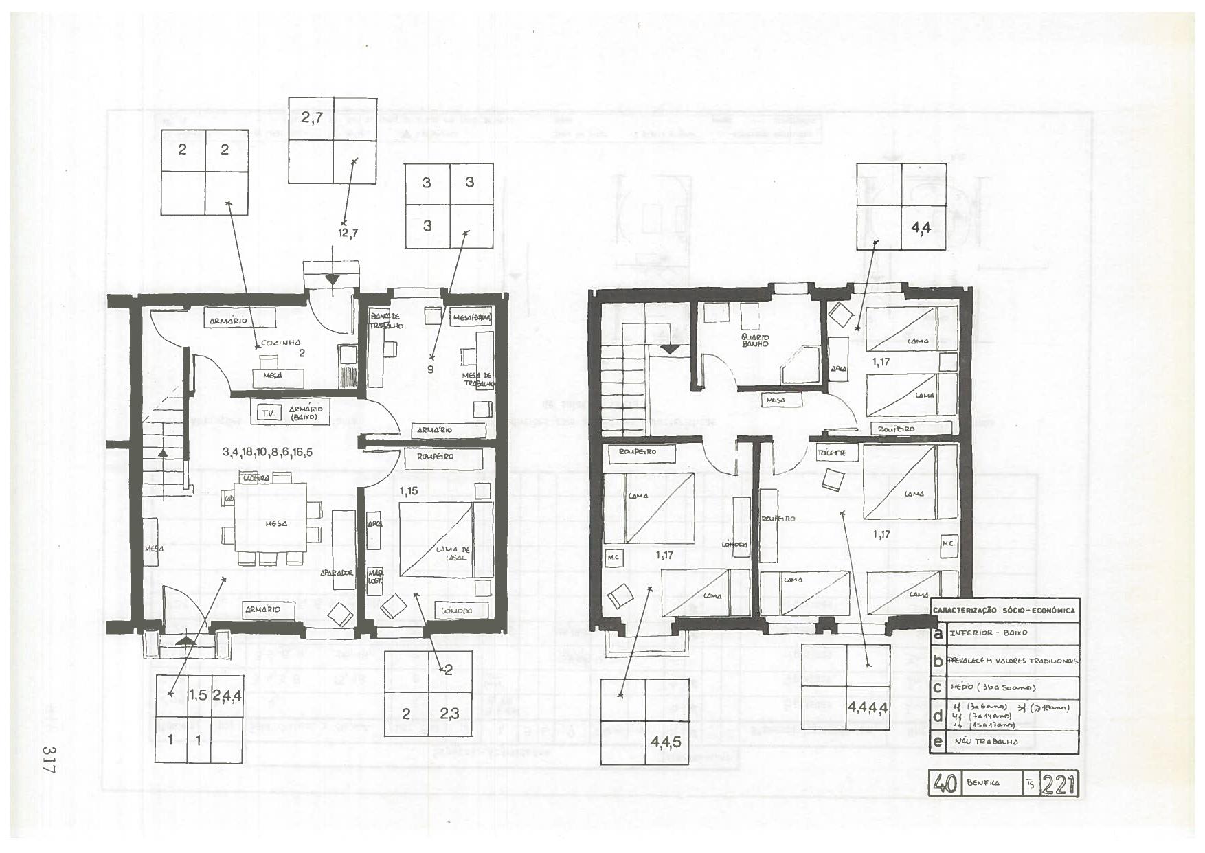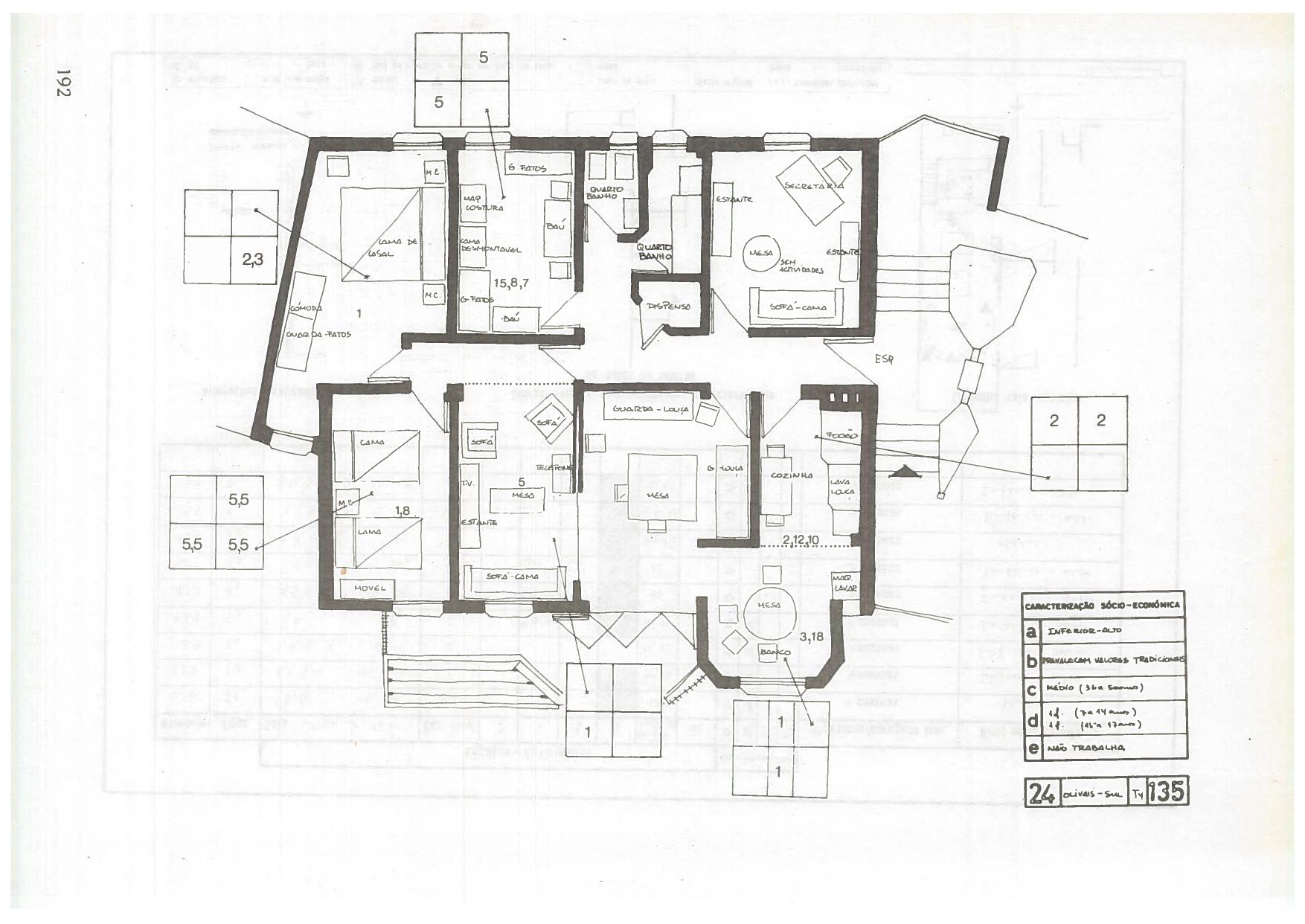 A series of interpretative and quantitative questionnaires were conducted on 300 families. For each family, a plan was published in the survey, providing information on where domestic activities take place, and where and when household members are usually located in the house. The interior space was divided into rooms labelled according to a general function, such as kitchen, living room and bedrooms. For each family, the arrangement and disposition of furniture were registered. In each labelled room, it was represented which domestic activities took place, and which family members were usually present at the different times of day (defined as morning, lunch time, afternoon, evening and night).
