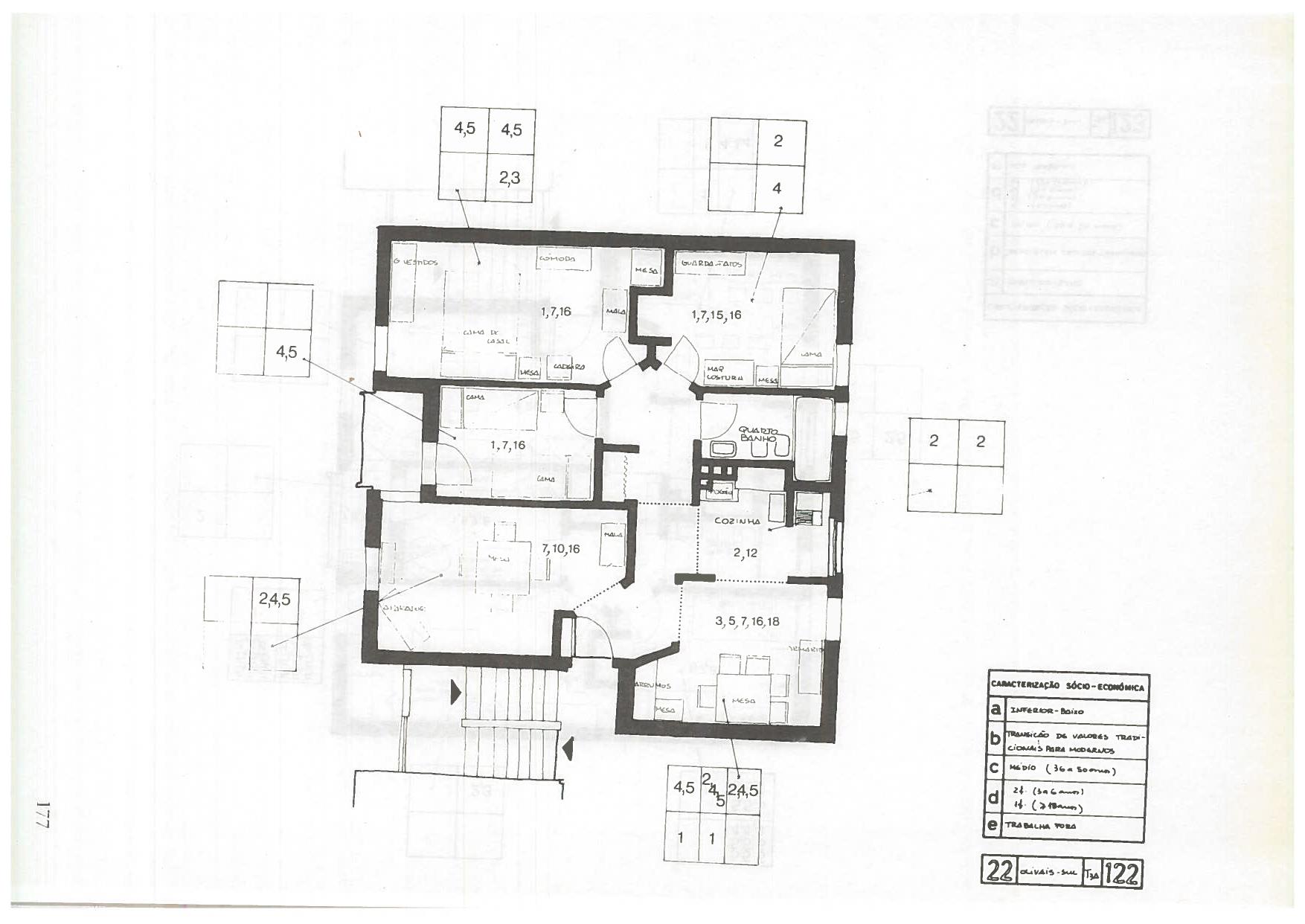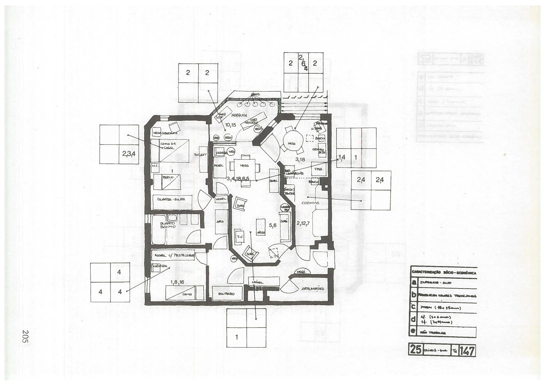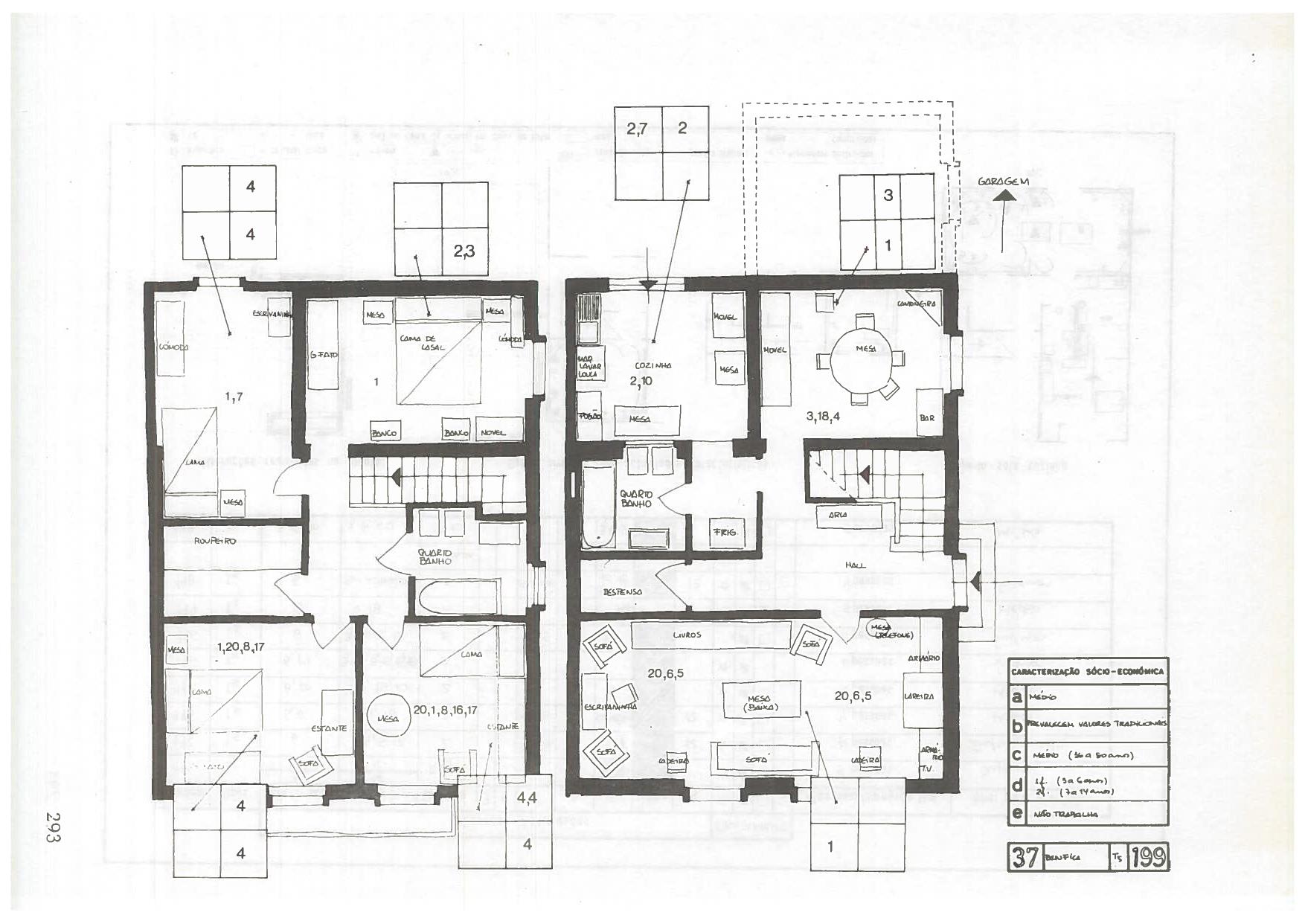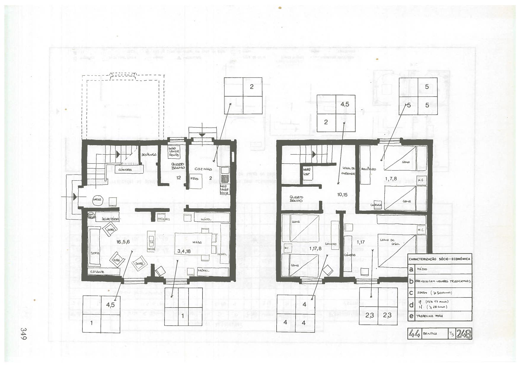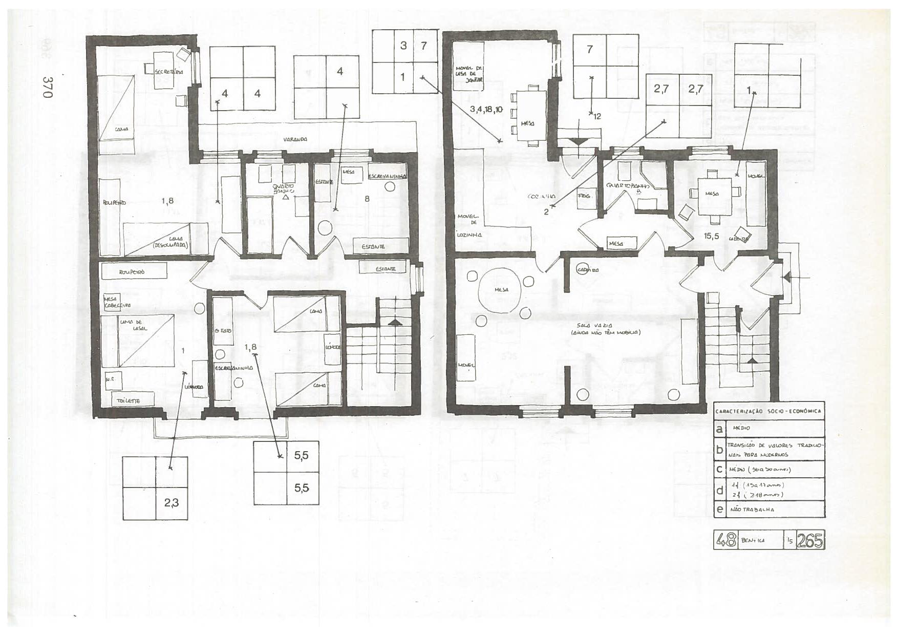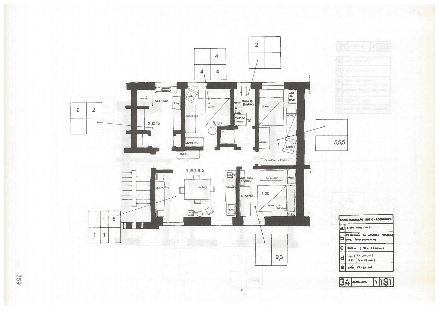A series of interpretative and quantitative questionnaires were conducted on 300 families. For each family, a plan was published in the survey, providing information on where domestic activities take place, and where and when household members are usually located in the house. The interior space was divided into rooms labelled according to a general function, such as kitchen, living room and bedrooms. For each family, the arrangement and disposition of furniture were registered. In each labelled room, it was represented which domestic activities took place, and which family members were usually present at the different times of day (defined as morning, lunch time, afternoon, evening and night).