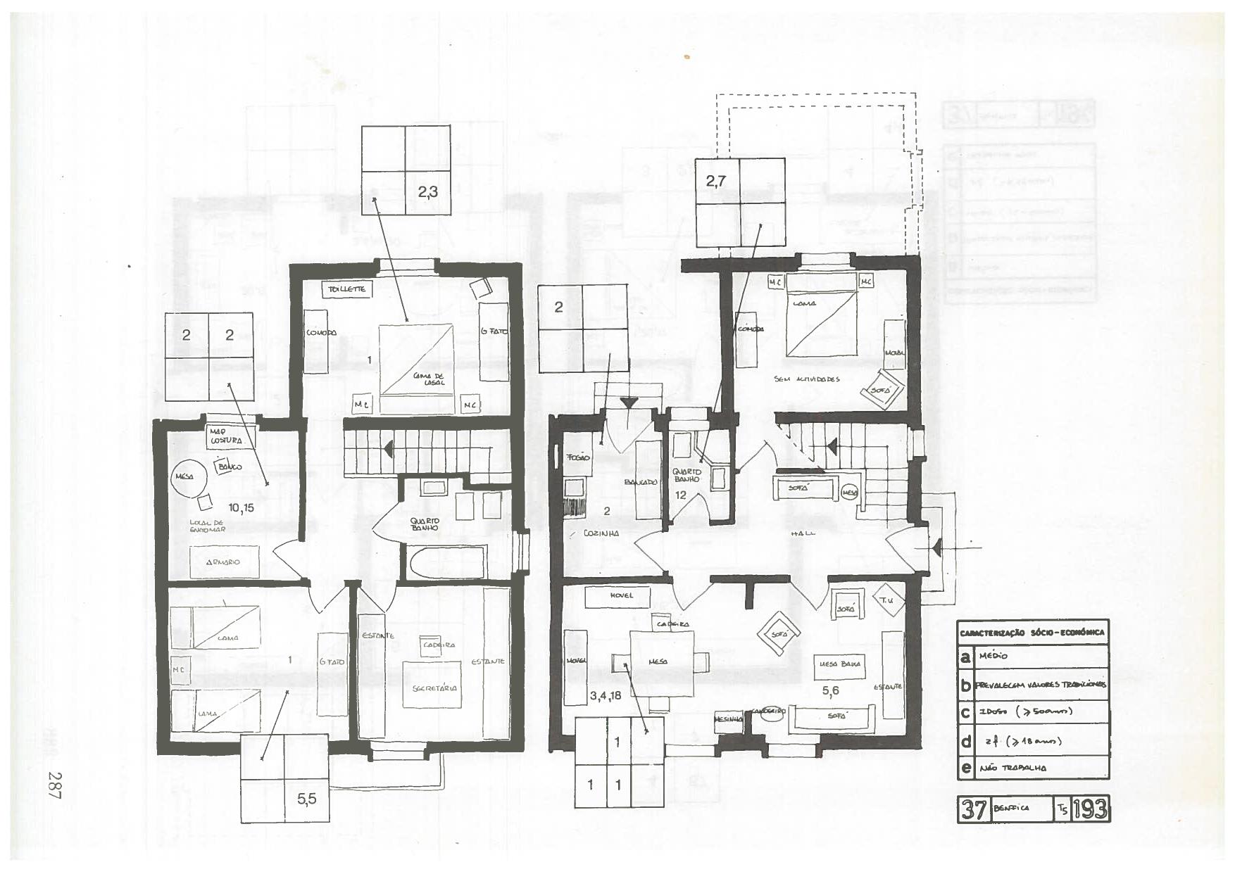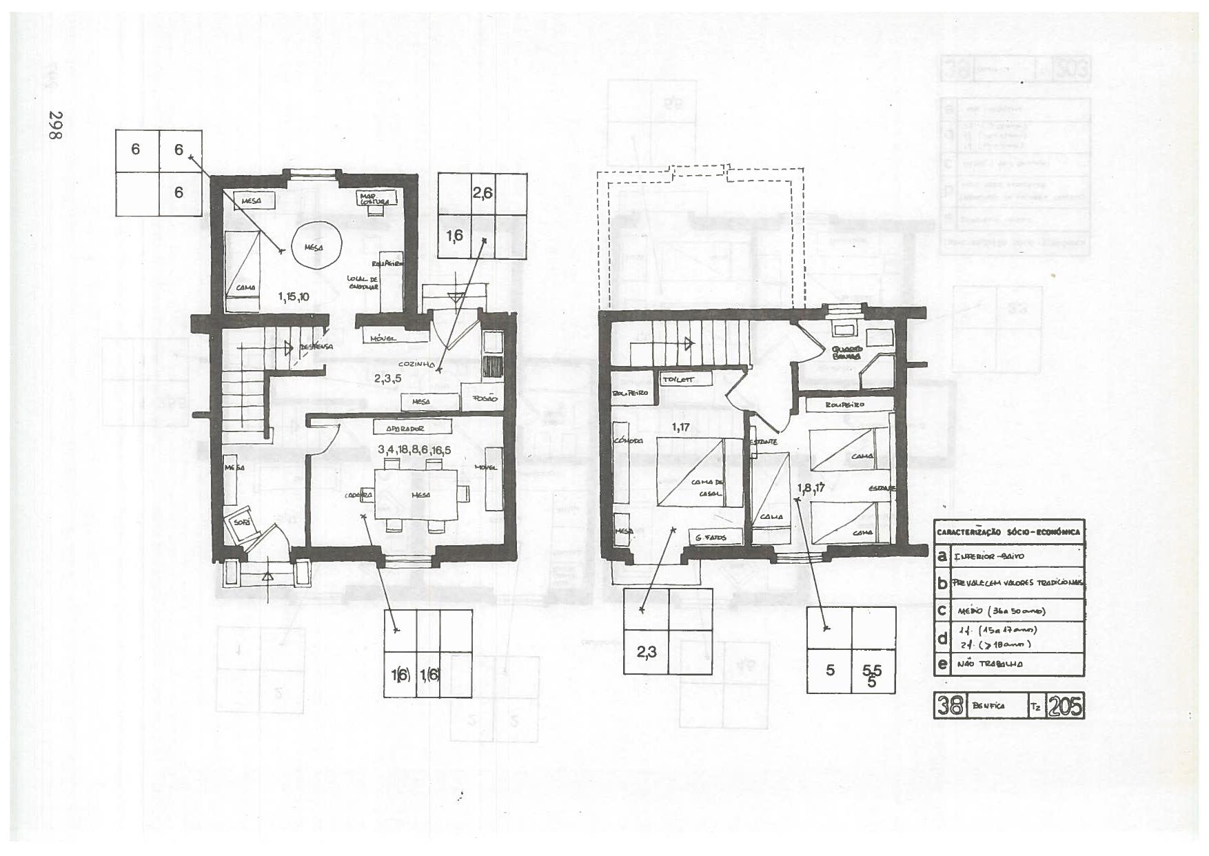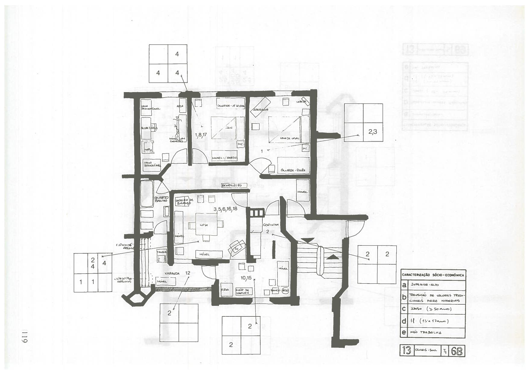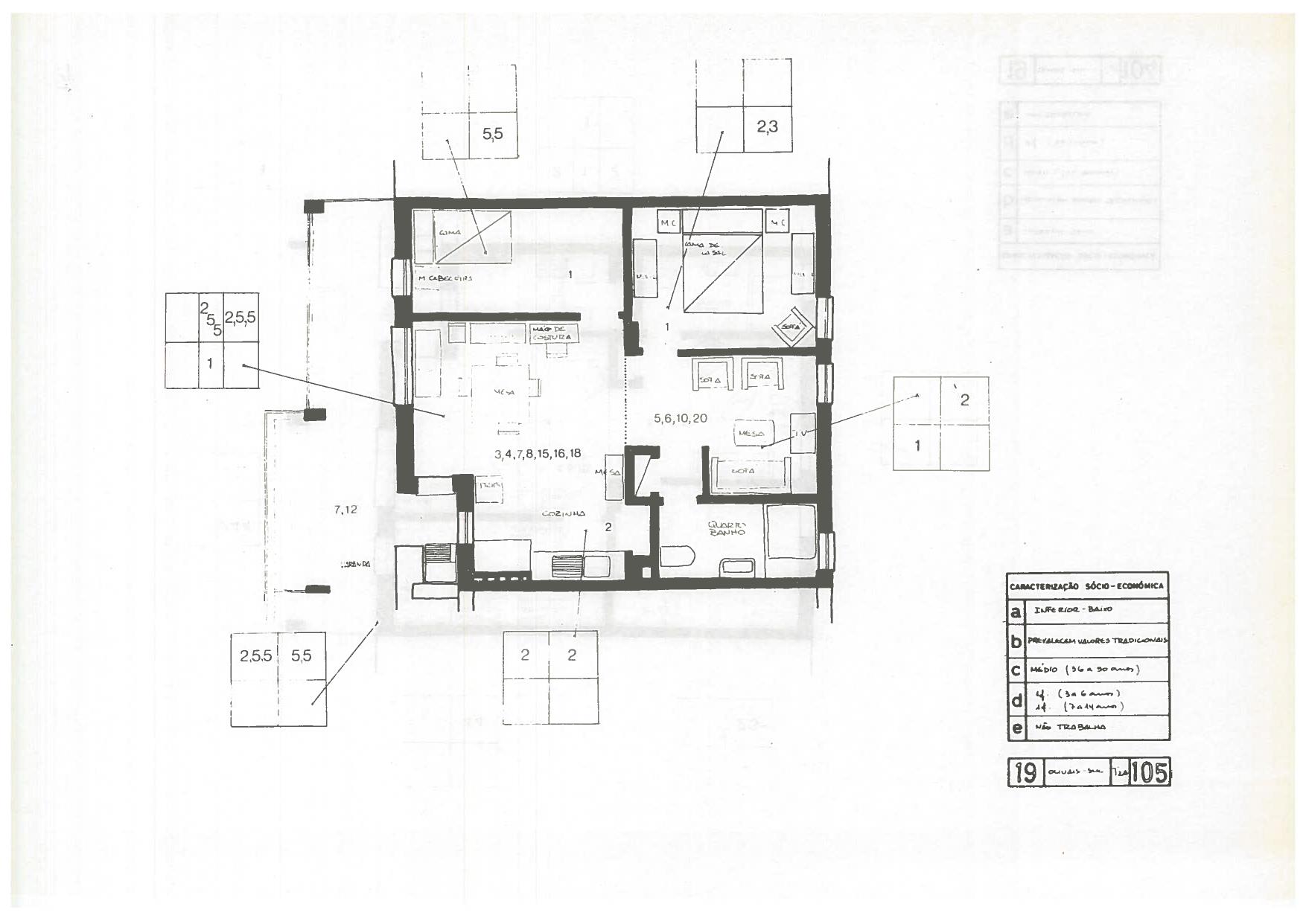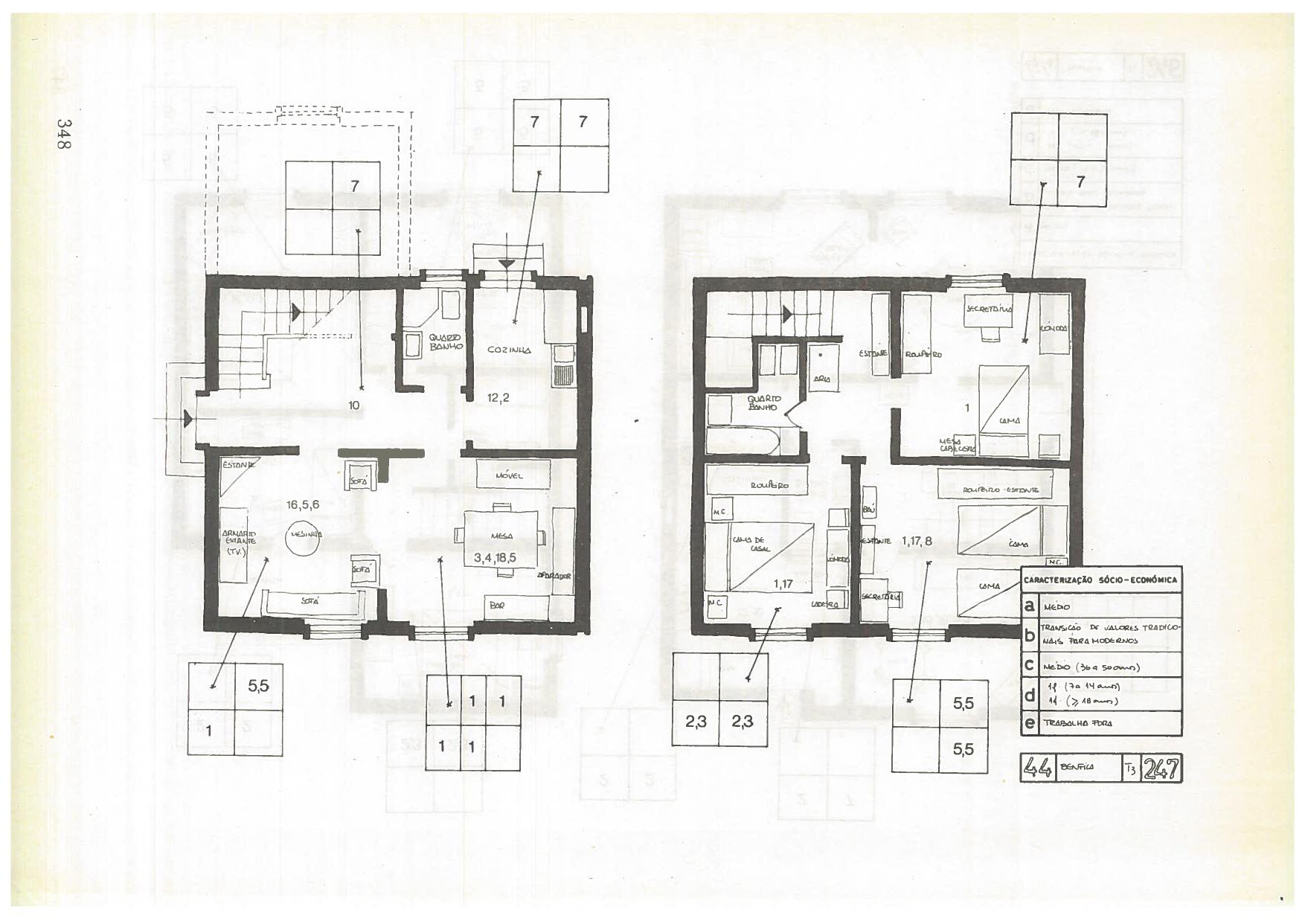 A series of interpretative and quantitative questionnaires were conducted on 300 families. For each family, a plan was published in the survey, providing information on where domestic activities take place, and where and when household members are usually located in the house. The interior space was divided into rooms labelled according to a general function, such as kitchen, living room and bedrooms. For each family, the arrangement and disposition of furniture were registered. In each labelled room, it was represented which domestic activities took place, and which family members were usually present at the different times of day (defined as morning, lunch time, afternoon, evening and night).