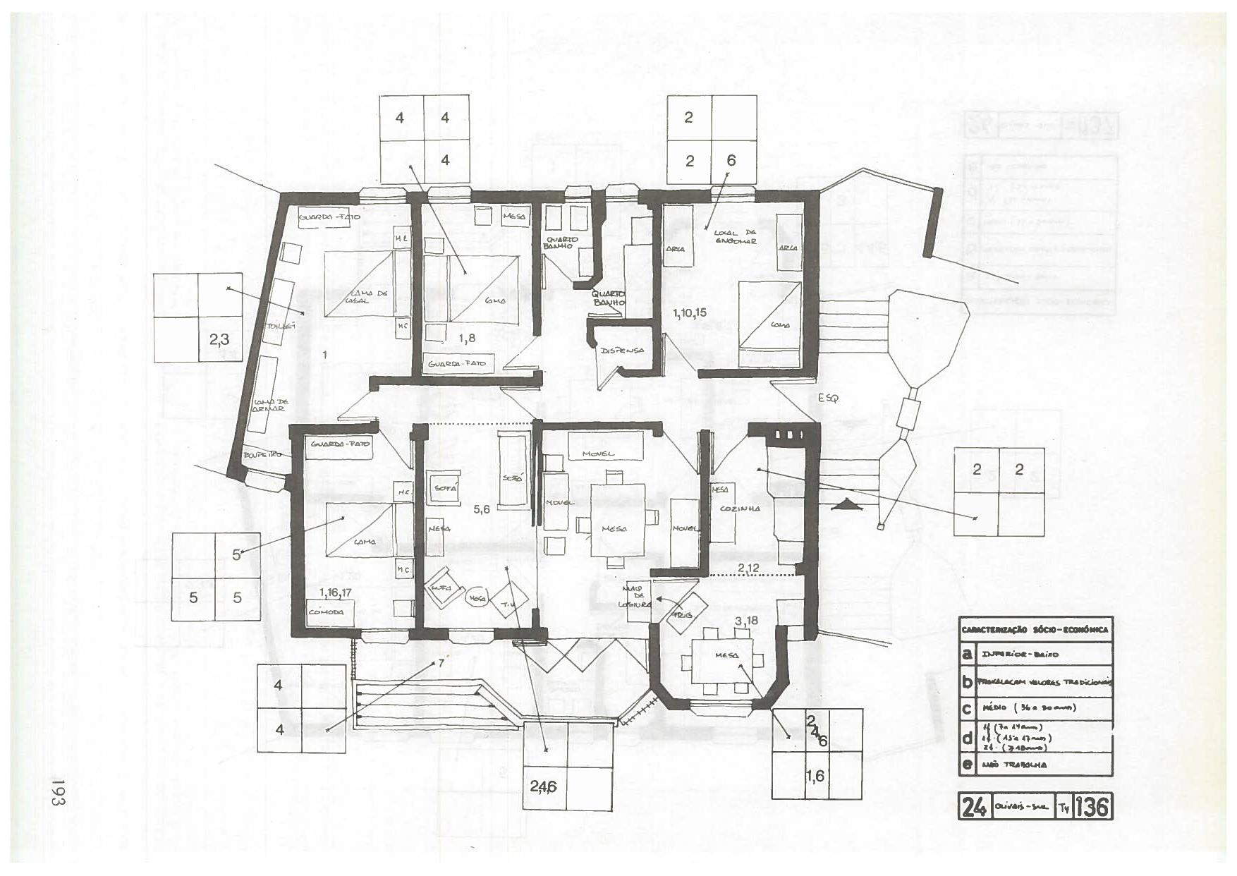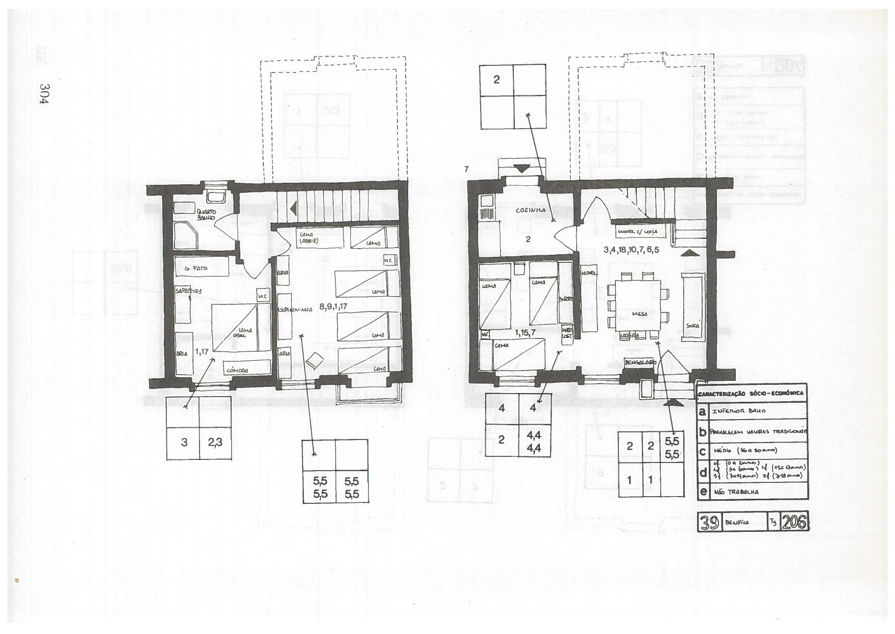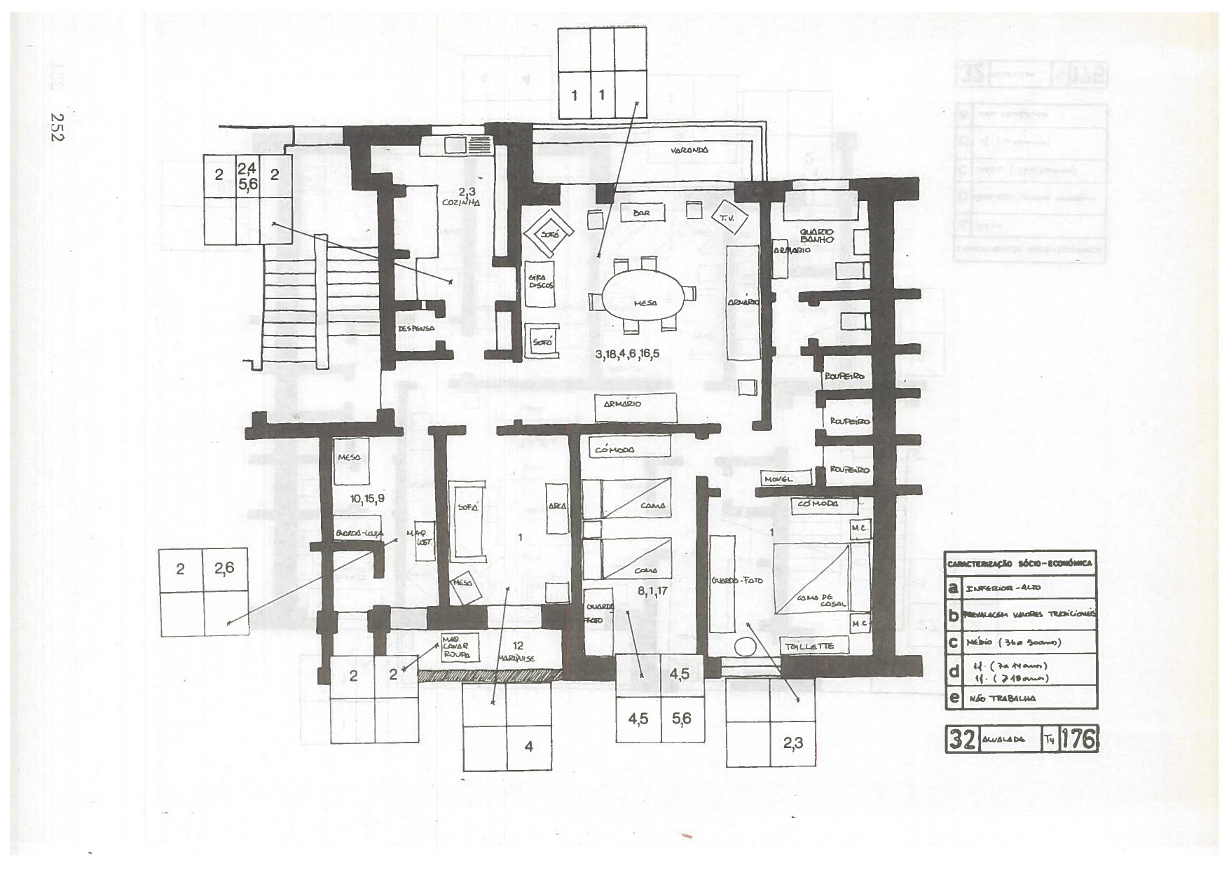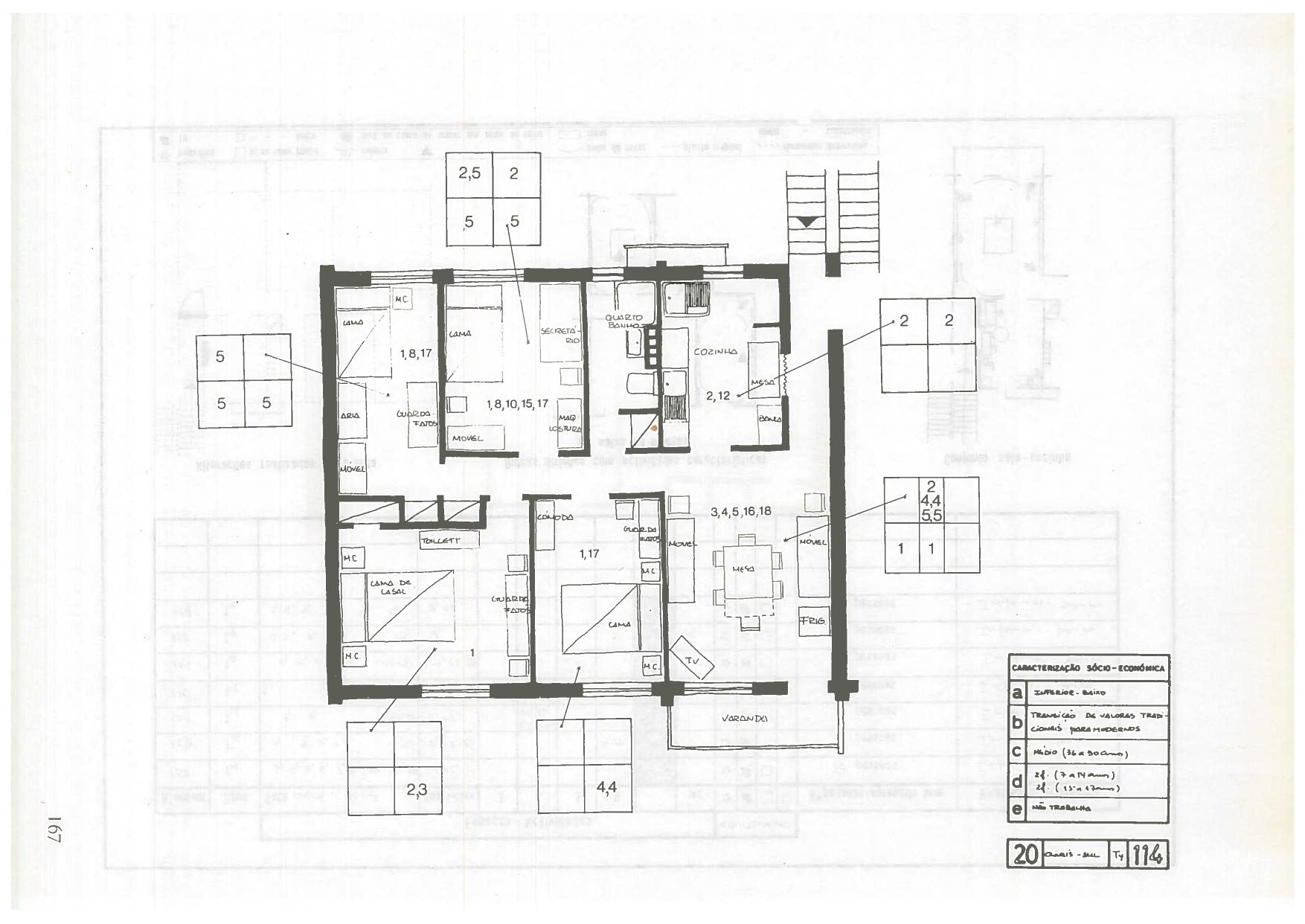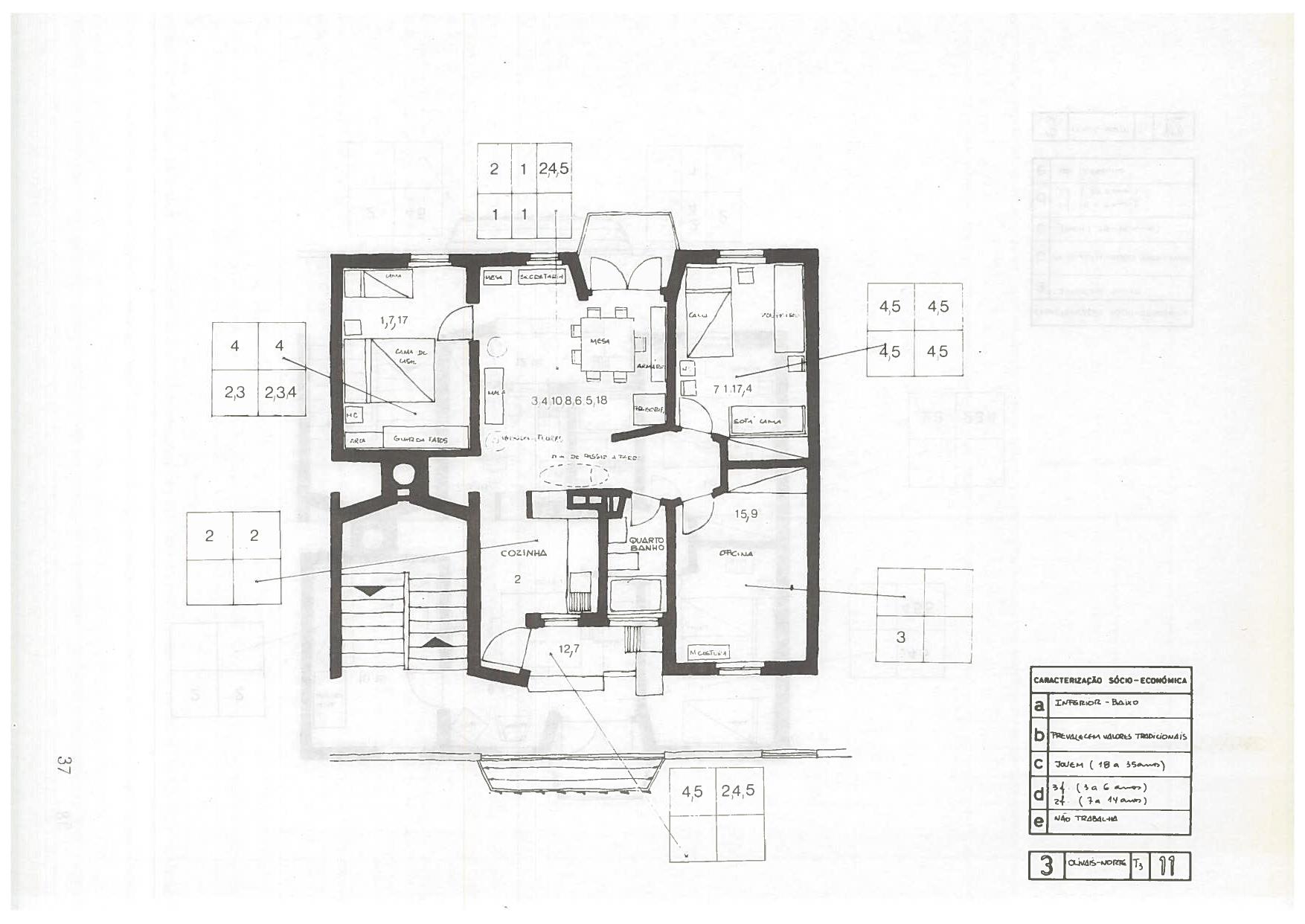 A series of interpretative and quantitative questionnaires were conducted on 300 families. For each family, a plan was published in the survey, providing information on where domestic activities take place, and where and when household members are usually located in the house. The interior space was divided into rooms labelled according to a general function, such as kitchen, living room and bedrooms. For each family, the arrangement and disposition of furniture were registered. In each labelled room, it was represented which domestic activities took place, and which family members were usually present at the different times of day (defined as morning, lunch time, afternoon, evening and night).